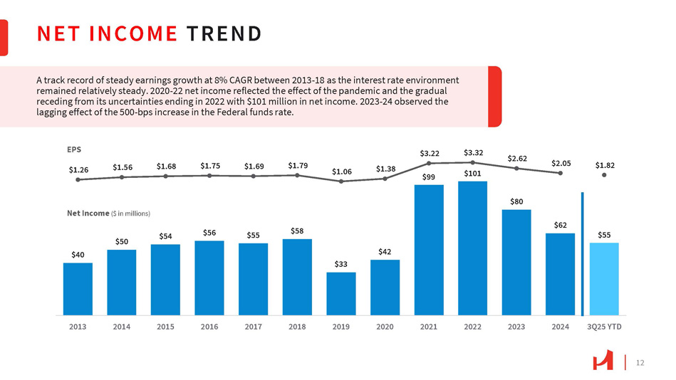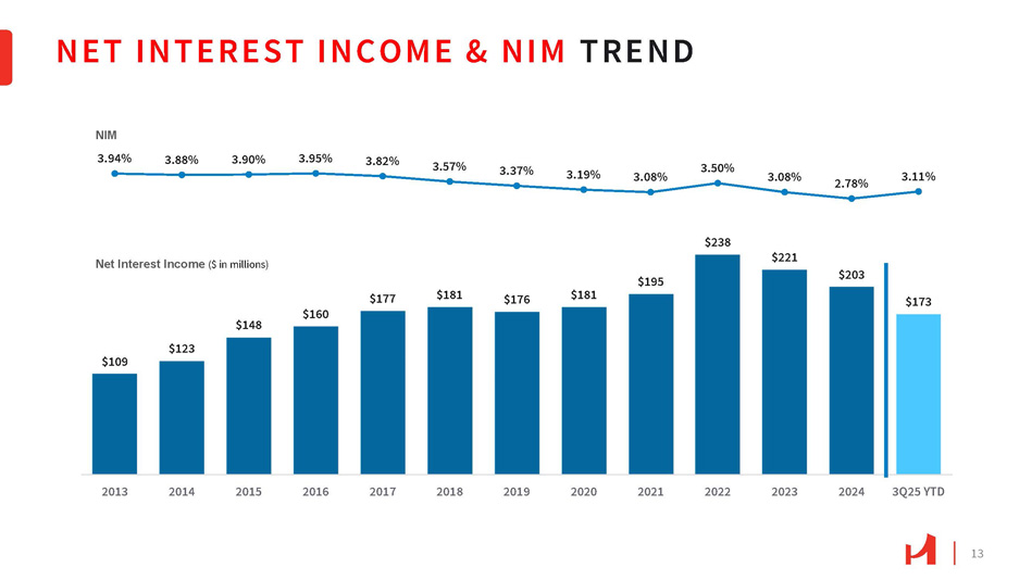 $40 $50 $54 $56 $55 $58 $33 $42 $99 $101 $80 $62 $55 $1.26 $1.56 $1.68 $1.75 $1.69 $1.79 $1.06 $1.38 $3.22 $3.32 $2.62 $2.05 $1.82 2013 2014 2015 2016 2017 2018 2019 2020 2021 2022 2023 2024 3Q25 YTD NET INCOME TREND 12 EPS Net Income ($ in millions) A track record of steady earnings growth at 8% CAGR between 2013 - 18 as the interest rate environment remained relatively steady. 2020 - 22 net income reflected the effect of the pandemic and the gradual receding from its uncertainties ending in 2022 with $101 million in net income. 2023 - 24 observed the lagging effect of the 500 - bps increase in the Federal funds rate.