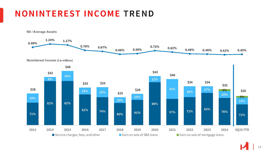 NET INTEREST INCOME & NIM TREND 13 NIM 3.94% Net Interest Income ($ in millions) $160 $148 $123 $109 $177 $181 $176 $181 $195 $238 $221 $203 $173 3.88% 3.90% 3.95% 3.82% 3.57% 3.37% 3.19% 3.08% 3.50% 3.08% 2.78% 3.11% 2013 2014 2015 2016 2017 2018 2019 2020 2021 2022 2023 2024 3Q25 YTD