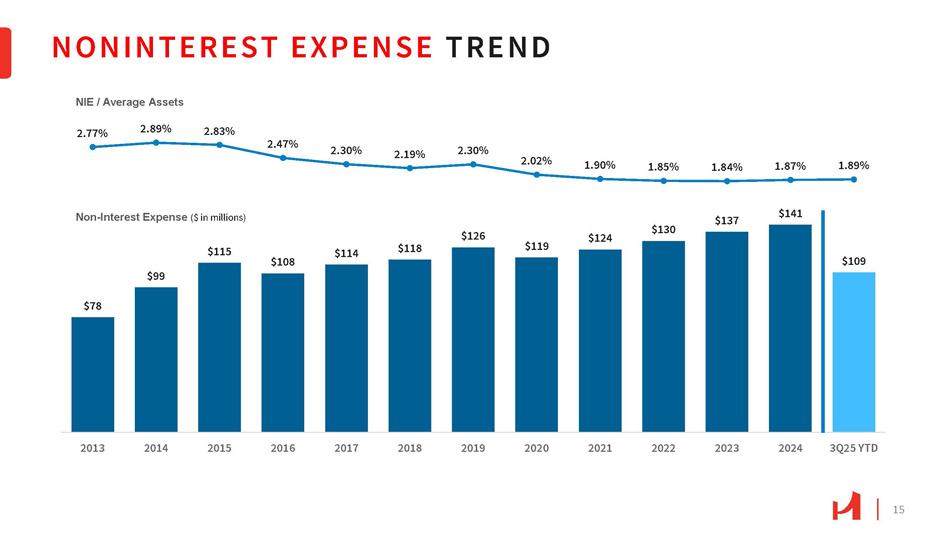 NONINTEREST INCOME TREND 14 NII / Average Assets 71% 92% 82% 82% 74% 80% 81% 88% 57% 72% 83% 76% 72% 29% 8% 18% 18% 26% 20% 19% 12% 43% 28% 17% 19% 23% 5% $28 $42 Noninterest Income ($ in millions) $48 $33 $33 $25 $28 $43 $40 $34 $34 $32 $26 5% 0.99% 1.24% 1.17% 0.76% 0.67% 0.46% 0.50% 0.73% 0.62% 0.49% 0.46% 0.42% 0.45% 2013 2014 2015 2016 2017 Service charges, fees, and other 2021 2022 2023 2024 3Q25 YTD Gain on sale of mortgage loans 2018 2019 2020 Gain on sale of SBA loans