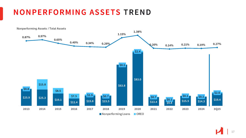 ALLOWANCE FOR CREDIT LOSSES TREND 16 Allowance for Credit Losses ($ in millions) $58 $53 $43 $32 $31 $32 $61 $90 $73 $72 $69 $70 $70 0.84% 0.72% 0.70% 1.35% 1.33% ACL / Total Loans 2.58% 1.89% 1.85% 1.41% 1.20% 1.12% 1.12% 1.07% 2013 2014 2015 2016 2017 2018 2019 2020 2021 2022 2023 2024 3Q25