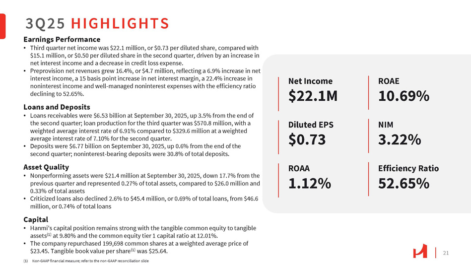 2 TABLE OF CONTENTS HANMI PROFILE 5 – 20 3Q25 PERFORMANCE RESULTS 21 – 37 LOAN PORTFOLIO DETAILS 3Q25 FINANCIAL SUMMARY NON - GAAP RECONCILIATION 49 – 50 38 – 47 48 – 48