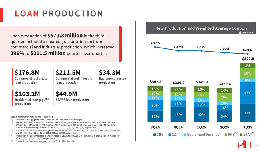 21 Earnings Performance • Third quarter net income was $22.1 million, or $0.73 per diluted share, compared with $15.1 million, or $0.50 per diluted share in the second quarter, driven by an increase in net interest income and a decrease in credit loss expense. • Preprovision net revenues grew 16.4%, or $4.7 million, reflecting a 6.9% increase in net interest income, a 15 basis point increase in net interest margin, a 22.4% increase in noninterest income and well - managed noninterest expenses with the efficiency ratio declining to 52.65%. Loans and Deposits • Loans receivables were $6.53 billion at September 30, 2025, up 3.5% from the end of the second quarter; loan production for the third quarter was $570.8 million, with a weighted average interest rate of 6.91% compared to $329.6 million at a weighted average interest rate of 7.10% for the second quarter. • Deposits were $6.77 billion on September 30, 2025, up 0.6% from the end of the second quarter; noninterest - bearing deposits were 30.8% of total deposits. Asset Quality • Nonperforming assets were $ 21 . 4 million at September 30 , 2025 , down 17 . 7 % from the previous quarter and represented 0 . 27 % of total assets, compared to $ 26 . 0 million and 0 . 33 % of total assets • Criticized loans also declined 2 . 6 % to $ 45 . 4 million, or 0 . 69 % of total loans, from $ 46 . 6 million, or 0 . 74 % of total loans Capital • Hanmi’s capital position remains strong with the tangible common equity to tangible assets (1) at 9.80% and the common equity tier 1 capital ratio at 12.01%. • The company repurchased 199,698 common shares at a weighted average price of $23.45. Tangible book value per share (1) was $25.64. (1) Non - GAAP financial measure; refer to the non - GAAP reconciliation slide Net Income $22.1M Diluted EPS $0.73 ROAA 1.12% ROAE 10.69% NIM 3.22% Efficiency Ratio 52.65% 3Q25 HIGHLIGHTS