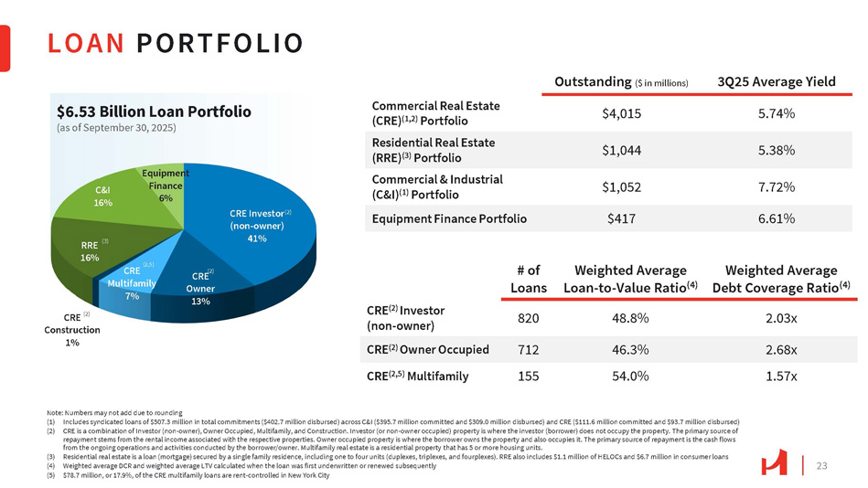 LOAN PRODUCTION 22 Loan production of $570.8 million in the third quarter included a meaningful contribution from commercial and industrial production, which increased 296% to $211.5 million quarter - over - quarter. Note: Numbers may not add due to rounding (1) Residential mortgage includes $0.0 million of consumer loans for 3Q25 (2) $51.6 million, $49.7 million, $55.2 million, $46.8 million, and $44.9 million of SBA loan production includes $25.6 million, $15.4 million, $30.8 million, $23.3 million, and $20.6 million of loans secured by CRE and the remainder representing C&I loans for 3Q24, 4Q24, 1Q25, 2Q25, and 3Q25, respectively (3) Production includes purchases of guaranteed SBA loans of $13.7 million, $20.3 million, $11.0 million, $0 million, and $0 million for 3Q24, 4Q24, 1Q25, 2Q25, and 3Q25, respectively (4) Production includes mortgage loan purchases of $10.7 million, $10.0 million, $10.3 million, and $3.0 million for 3Q24, 1Q25, 2Q25, and 3Q25, respectively (5) Production includes C&I loan purchases of $0.6 million for 4Q24 $176.8M Commercial real estate loan production $211.5M Commercial and industrial loan production $34.3M Equipment finance production $103.2M Residential mortgage (1,4) production $44.9M SBA (2,3) loan production 32% 43% 42% 31% 37% 6% $347.8 15% 12% 11% 30% $339.0 15% 12% 12% 18% $345.9 16% 16% 14% 12% $329.6 14% 26% 10% 16% 34% $570.8 8% 18% 7.92% 7.37% 7.35% 7.10% 6.91% 4Q24 C&I (5) 3Q25 SBA (2,3) 3Q24 CRE 1Q25 Equipment Finance 2Q25 RRE (1,4) New Production and Weighted Average Coupon ($ in millions)