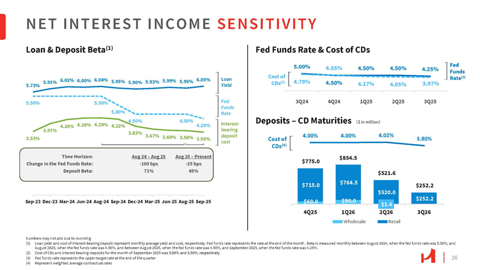 26 5.73% 5.91% 6.02% 6.00% 6.04% 5.95% 5.90% 5.93% 5.99% 5.95% 6.05% 3.53% 3.97% 5.50% 5.50% 5.00% 4.50% 4.20% 4.28% 4.29% 4.22% 3.83% 4.50% 4.25% 3.67% 3.60% 3.58% 3.50% Sep - 23 Dec - 23 Mar - 24 Jun - 24 Aug - 24 Sep - 24 Dec - 24 Mar - 25 Jun - 25 Aug - 25 Sep - 25 NET INTEREST INCOME SENSITIVITY $60.0 $90.0 $1.6 $715.0 $764.5 $520.0 $775.0 $854.5 $521.6 $252.2 $252.2 4.00% 4.00% 4.02% 3.80% 4Q25 3Q26 1Q26 Wholesale 2Q26 Retail 5.00% 4.50% 4.55% 4.50% 4.50% 4.25% 4.79% 4.17% 4.05% 3.97% 3Q24 4Q24 1Q25 Deposits – CD Maturities 㸦 $ in million 㸧 2Q25 3Q25 Fed Funds Rate (3) Cost of CDs (4) Numbers may not add due to rounding (1) Loan yield and cost of interest - bearing deposit represent monthly average yield and cost, respectively. Fed funds rate represents the rate at the end of the month. Beta is measured monthly between August 2024, when the fed funds rate was 5.50%, and August 2025, when the fed funds rate was 4.50%, and between August 2025, when the fed funds rate was 4.50%, and September 2025, when the fed funds rate was 4.25%. (2) Cost of CDs and interest bearing - deposits for the month of September 2025 wa s 3.93% and 3.50%, respectively (3) Fed funds rate represents the upper - target rate at the end of the quarter (4) Represent weighted average contractual rates Fed Funds Rate Interest - bearing deposit cost Loan Yield Loan & Deposit Beta (1) Fed Funds Rate & Cost of CDs Cost of CDs (2) Time Horizon: Change in the Fed Funds Rate: Deposit Beta: Aug 24 – Aug 25 - 100 bps 71% Aug 25 – Present - 25 bps 45%