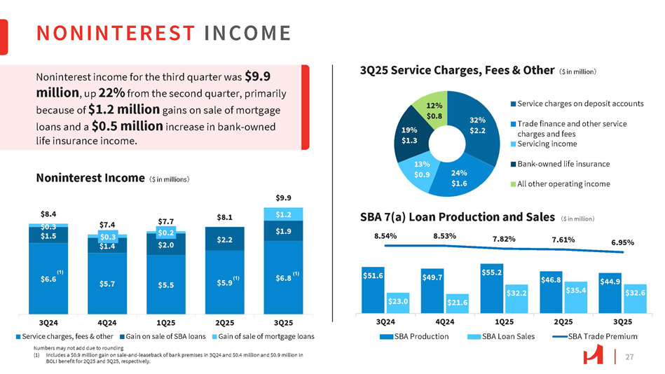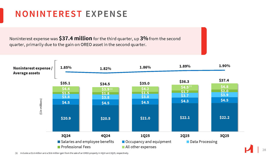 27 32% $2.2 24% $1.6 13% $0.9 19% $1.3 12% $0.8 Service charges on deposit accounts Trade finance and other service charges and fees Servicing income Bank - owned life insurance All other operating income NONINTEREST INCOME $51.6 $49.7 $55.2 $46.8 $44.9 $23.0 $21.6 $32.2 $35.4 $32.6 8.54% 8.53% 7.82% 7.61% 6.95% 3Q24 4Q24 SBA Production 1Q25 SBA Loan Sales 2Q25 3Q25 SBA Trade Premium $5.7 $5.5 $5.9 $1.4 $2.0 $2.2 $0.3 $0.2 $1.2 $1.9 $8.4 $0.3 $1.5 $7.4 $7.7 $8.1 $9.9 3Q24 4Q24 Service charges, fees & other 1Q25 Gain on sale of SBA loans 2Q25 3Q25 Gain of sale of mortgage loans (1) $6.6 Numbers may not add due to rounding (1) Includes a $0.9 million gain on sale - and - leaseback of bank premises in 3Q24 and $0.4 million and $0.9 million in BOLI benefit for 2Q25 and 3Q25, respectively. Noninterest income for the third quarter was $9.9 million , up 22% from the second quarter, primarily because of $1.2 million gains on sale of mortgage loans and a $0.5 million increase in bank - owned life insurance income. Noninterest Income 㸦 $ in millions 㸧 3Q25 Service Charges, Fees & Other 㸦 $ in million 㸧 SBA 7(a) Loan Production and Sales 㸦 $ in million 㸧 (1) $6.8 (1)