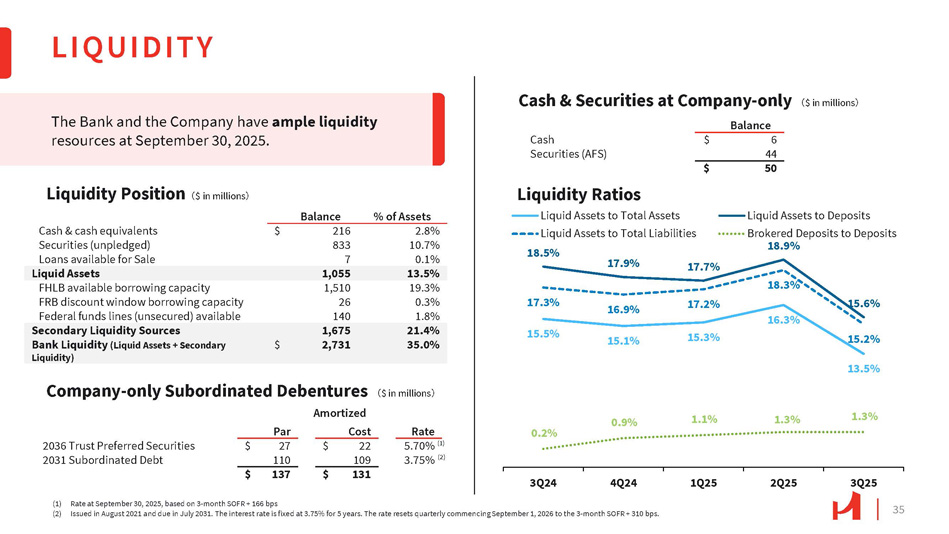 34 15 Year 66% 20 Year 20% SECURITIES PORTFOLIO $162 $223 $267 $134 $25 $29 $23 $16 $187 $252 $290 $150 2024 Actual 2027 2026 Interest 3% US Agy MBS - Residential 61% US Agy MBS - Commercial 17% US Agy CMO 7% Municipal 12% US Agy 8% US Agy MBS - Residential 43% US Agy MBS - Commerical 7% US Agy CMO 21% Municipal UST 7% 14% Available for Sale (1) $972 Million < 1 Year 16% 1 to 3 Year 18% 3 to 5 Years 41% > 5 Years 25% Unrealized Loss $68 Million US Agy Securities Duration 3.9 Years $435 Million 30 Year (2) 14% 2025 (3) Principal Note: Numbers may not add due to rounding (1) Based on the book value (2) 98.0% constitutes CRA bonds (3) 2025 year - to - date observed $169.5 million of principal paydown and $21.9 million of interest payments The $972.4 million securities portfolio (all AFS, no HTM) represented 12% of assets at September 30, 2025 and had a weighted average modified duration of 3.9 years with $67.6 million in an unrealized loss position. Principal Paydowns (3) 㸦 $ in millions 㸧 US Agy Residential MBS (2) (Maturity)