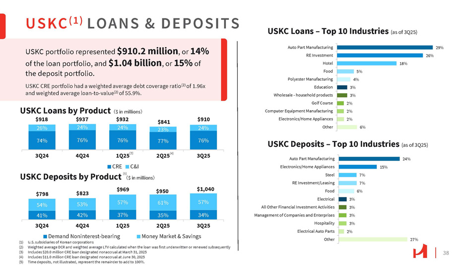 USKC ( 1 ) LOANS & DEPOSITS USKC portfolio represented $910.2 million , or 14% of the loan portfolio, and $1.04 billion , or 15% of the deposit portfolio. USKC CRE portfolio had a weighted average debt coverage ratio (2) of 1.96x and weighted average loan - to - value (2) of 55.9%. USKC Loans – Top 10 Industries (as of 3Q25) 29% 26% 18% 5% 4% 3% 3% 2% 2% 2% 6% Auto Part Manufacturing RE Investment Hotel Food Polyester Manufacturing Education Wholesale - household products Golf Course Computer Equipment Manufacturing Electronics/Home Appliances Other 24% Auto Part Manufacturing 15% Electronics/Home Appliances 7% Steel 7% RE Investment/Leasing 6% Food 3% Electrical 3% All Other Financial Investment Activities 3% Management of Companies and Enterprises 3% Hospitality 2% Electrical Auto Parts 27% Other 38 USKC Deposits – Top 10 Industries (as of 3Q25) $918 26% 74% $937 24% 76% $932 24% 76% $841 23% 77% $910 24% 76% 3Q24 4Q24 3Q25 USKC Loans by Product 㸦 $ in millions 㸧 1Q25 (3) CRE C&I 2Q25 (4) USKC Deposits by Product 㸦 $ in millions 㸧 $798 $823 $969 $950 57% 61% 57% 53% 54% 34% 35% 37% 42% 41% 3Q25 2Q25 1Q25 4Q24 3Q24 $1,040 Demand Noninterest - bearing Money Market & Savings (1) U.S. subsidiaries of Korean corporations (2) Weighted average DCR and weighted average LTV calculated when the loan was first underwritten or renewed subsequently (3) Includes $20.0 million CRE loan designated nonaccrual at March 31, 2025 (4) Includes $11.0 million CRE loan designated nonaccrual at June 30, 2025 (5) Time deposits, not illustrated, represent the remainder to add to 100%. (5)