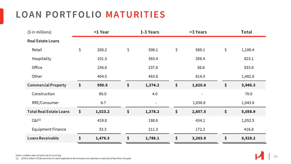 39 Total >3 Years 1 - 3 Years <1 Year ($ in millions) Real Estate Loans 1,106.4 $ 589.1 $ 309.1 $ 208.2 $ Retail 823.1 358.4 363.4 101.3 Hospitality 533.0 58.6 237.8 236.6 Office 1,482.8 614.5 463.8 404.5 Other 3,945.3 $ 1,620.6 $ 1,374.2 $ 950.5 $ Commercial Property 70.0 - 4.0 66.0 Construction 1,043.6 1,036.9 - 6.7 RRE/Consumer 5,058.9 $ 2,657.5 $ 1,378.2 $ 1,023.2 $ Total Real Estate Loans 1,052.5 434.1 198.6 419.8 C&I (1) 416.8 172.2 211.3 33.3 Equipment Finance 6,528.2 $ 3,263.9 $ 1,788.1 $ 1,476.3 $ Loans Receivable LOAN PORTFOLIO MATURITIES Note: numbers may not add due to rounding (1) $379.5 million of C&I are lines of credit expected to be renewed and maintain a maturity of less than one year