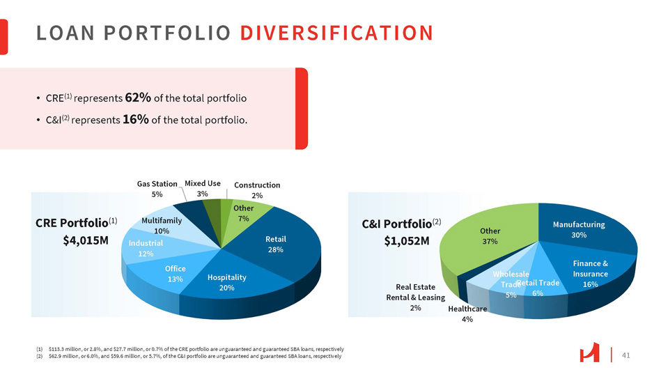 40 LOAN PORTFOLIO DISTRIBUTION Residential Real Estate & Equipment Finance C&I CRE Equipment Finance Residential Real Estate Lines of Credit (2) Term (2) Construction (1) Multifamily Non - owner Occupied Owner Occupied ($ in millions) $417 $1,044 $502 $550 $70 $440 $2,658 $847 Total Balance $0.04 $0.56 $0.83 $0.47 $9.99 $2.84 $3.24 $1.19 Average $0.03 $0.46 $0.15 $0.07 $6.43 $1.09 $1.22 $0.38 Median $224 $461 $425 $491 $49 $311 $1,889 $635 Top Quintile Balance (3) $0.1 or more $0.8 or more $0.7 or more $0.2 or more $15.4 or more $2.9 or more $3.8 or more $1.3 or more Top Quintile Loan Size $0.11 $1.26 $4.34 $2.12 $24.49 $10.02 $11.59 $4.51 Top Quintile Average $0.09 $0.96 $1.29 $0.43 $24.49 $4.95 $7.99 $2.43 Top Quintile Median (1) Represents the total outstanding amount. Advances require authorization and disbursement requests, depending on the progress of the project and inspections. Advances are non - revolving and are made throughout the term, up to the original commitment amount (2) Term loans are a commitment for a specified term. Majority of the Lines of Credit are revolving, including commercial revolvers, with some non - revolvers (sub - notes and working capital tranches) (3) Top quintile represents top 20% of the loans