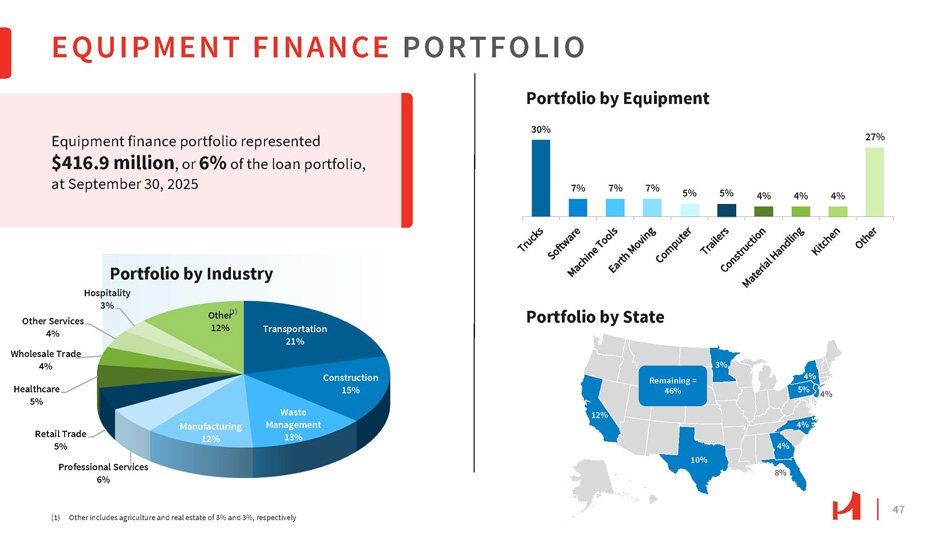 4% 4% 5% Remaining = 46% 12% 10% 4% 8% 4% 3% EQUIPMENT FINANCE PORTFOLIO 47 Transportation 21% Construction 15% Waste Management 13% Manufacturing 12% Professional Services 6% Retail Trade 5% Other Services 4% Wholesale Trade 4% Healthcare 5% Hospitality 3% Portfolio by Industry Other (1) 12% (1) Other includes agriculture and real estate of 3% and 3%, respectively Equipment finance portfolio represented $416.9 million , or 6% of the loan portfolio, at September 30, 2025 30% 7% 7% 7% 5% 5% 4% 4% 4% 27% Portfolio by Equipment Portfolio by State