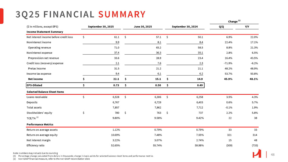 48 3 Q 25 FINANCIAL SUMMARY Note: numbers may not add due to rounding (1) Percentage change calculated from dollars in thousands; change in basis points for selected balance sheet items and performance metrics (2) Non - GAAP financial measure, refer to the non - GAAP reconciliation slide ($ in millions, except EPS) September 30, 2025 June 30, 2025 Income Statement Summary September 30, 2024 Q/Q Y/Y 22.0% 6.9% 50.1 $ 57.1 $ 61.1 $ Net interest income before credit loss 17.1% 22.4% 8.4 8.1 9.9 Noninterest income 21.3% 8.8% 58.5 65.2 71.0 Operating revenue 6.5% 2.8% 35.1 36.3 37.4 Noninterest expense 43.5% 16.4% 23.4 28.9 33.6 Preprovision net revenue - 6.2% - 71.9% 2.3 7.6 2.1 Credit loss (recovery) expense 48.9% 48.2% 21.1 21.2 31.5 Pretax income 50.8% 53.7% 6.2 6.1 9.4 Income tax expense 48.1% 45.9% 14.9 $ 15.1 $ 22.1 $ Net income 0.49 $ 0.50 $ 0.73 $ EPS - Diluted Selected Balance Sheet Items 4.3% 3.5% 6,258 $ 6,306 $ 6,528 $ Loans receivable 5.7% 0.6% 6,403 6,729 6,767 Deposits 1.9% - 0.1% 7,712 7,862 7,857 Total assets 5.8% 2.2% 737 $ 763 $ 780 $ Stockholders' equity 38 22 9.42% 9.58% 9.80% TCE/TA (2) Performance Metrics 33 33 0.79% 0.79% 1.12% Return on average assets 314 321 7.55% 7.48% 10.69% Return on average equity 48 15 2.74% 3.07% 3.22% Net interest margin (733) (309) 59.98% 55.74% 52.65% Efficiency ratio Change (1)