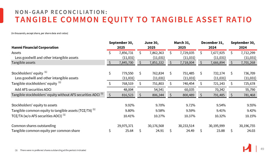 49 NON - G A A P R E C O N C I L I A T I O N : TANGIBLE COMMON EQUITY TO TANGIBLE ASSET RATIO (1) There were no preferred shares outstanding at the periods indicated September 30, December 31, March 31, June 30, September 30, 2024 2024 2025 2025 2025 Hanmi Financial Corporation 7,712,299 $ 7,677,925 $ 7,729,035 $ 7,862,363 $ 7,856,731 $ Assets (11,031) (11,031) (11,031) (11,031) (11,031) Less goodwill and other intangible assets $ 7,701,268 $ 7,666,894 $ 7,718,004 $ 7,851,332 $ 7,845,700 Tangible assets 736,709 $ 732,174 $ 751,485 $ 762,834 $ 779,550 $ Stockholders' equity (1) (11,031) (11,031) (11,031) (11,031) (11,031) Less goodwill and other intangible assets 725,678 $ 721,143 $ 740,454 $ 751,803 $ 768,519 $ (1) Tangible stockholders' equity 55,790 70,342 60,035 54,541 48,004 Add AFS securities AOCI $ 781,468 $ 791,485 $ 800,489 $ 806,344 $ 816,523 Tangible stockholders' equity without AFS securities AOCI (1) 9.55% 9.54% 9.72% 9.70% 9.92% Stockholders' equity to assets 9.42% 9.41% 9.59% 9.58% 9.80% Tangible common equity to tangible assets (TCE/TA) (1) 10.15% 10.32% 10.37% 10.27% 10.41% TCE/TA (w/o AFS securities AOCI) (1) 30,196,755 30,195,999 30,233,514 30,176,568 29,975,371 Common shares outstanding 24.03 $ 23.88 $ 24.49 $ 24.91 $ 25.64 $ Tangible common equity per common share (In thousands, except share, per share data and ratios)