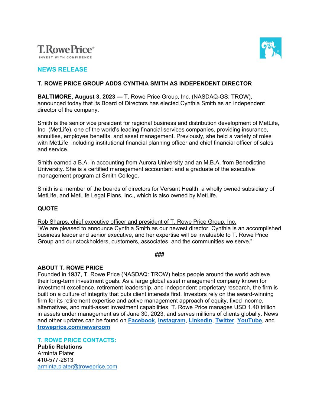 NEWS RELEASE T. ROWE PRICE GROUP ADDS CYNTHIA SMITH AS INDEPENDENT DIRECTOR BALTIMORE, August 3, 2023 — T. Rowe Price Group, Inc. (NASDAQ-GS: TROW), announced today that its Board of Directors has elected Cynthia Smith as an independent director of the company. Smith is the senior vice president for regional business and distribution development of MetLife, Inc. (MetLife), one of the world’s leading financial services companies, providing insurance, annuities, employee benefits, and asset management. Previously, she held a variety of roles with MetLife, including institutional financial planning officer and chief financial officer of sales and service. Smith earned a B.A. in accounting from Aurora University and an M.B.A. from Benedictine University. She is a certified management accountant and a graduate of the executive management program at Smith College. Smith is a member of the boards of directors for Versant Health, a wholly owned subsidiary of MetLife, and MetLife Legal Plans, Inc., which is also owned by MetLife. QUOTE Rob Sharps, chief executive officer and president of T. Rowe Price Group, Inc. "We are pleased to announce Cynthia Smith as our newest director. Cynthia is an accomplished business leader and senior executive, and her expertise will be invaluable to T. Rowe Price Group and our stockholders, customers, associates, and the communities we serve.” ### ABOUT T. ROWE PRICE Founded in 1937, T. Rowe Price (NASDAQ: TROW) helps people around the world achieve their long-term investment goals. As a large global asset management company known for investment excellence, retirement leadership, and independent proprietary research, the firm is built on a culture of integrity that puts client interests first. Investors rely on the award-winning firm for its retirement expertise and active management approach of equity, fixed income, alternatives, and multi-asset investment capabilities. T. Rowe Price manages USD 1.40 trillion in assets under management as of June 30, 2023, and serves millions of clients globally. News and other updates can be found on Facebook, Instagram, LinkedIn, Twitter, YouTube, and troweprice.com/newsroom. T. ROWE PRICE CONTACTS: Public Relations Arminta Plater 410-577-2813 arminta.plater@troweprice.com