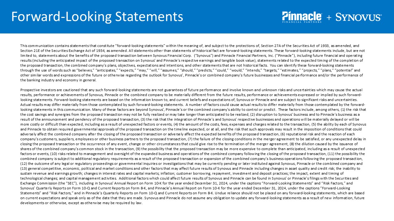 Forward-Looking Statements  This communication contains statements that constitute “forward-looking statements” within the meaning of, and subject to the protections of, Section 27A of the Securities Act of 1933, as amended, and Section 21E of the Securities Exchange Act of 1934, as amended. All statements other than statements of historical fact are forward-looking statements. These forward-looking statements include, but are not limited to, statements about the benefits of the proposed transaction between Synovus Financial Corp. (“Synovus”) and Pinnacle Financial Partners, Inc. (“Pinnacle”), including future financial and operating results (including the anticipated impact of the proposed transaction on Synovus’ and Pinnacle’s respective earnings and tangible book value), statements related to the expected timing of the completion of the proposed transaction, the combined company’s plans, objectives, expectations and intentions, and other statements that are not historical facts. You can identify these forward-looking statements through the use of words such as “believes,” “anticipates,” “expects,” “may,” “will,” “assumes,” “should,” “predicts,” “could,” “would,” “intends,” “targets,” “estimates,” “projects,” “plans,” “potential” and other similar words and expressions of the future or otherwise regarding the outlook for Synovus’, Pinnacle’s or combined company’s future businesses and financial performance and/or the performance of the banking industry and economy in general.  Prospective investors are cautioned that any such forward-looking statements are not guarantees of future performance and involve known and unknown risks and uncertainties which may cause the actual results, performance or achievements of Synovus, Pinnacle or the combined company to be materially different from the future results, performance or achievements expressed or implied by such forward-looking statements. Forward-looking statements are based on the information known to, and current beliefs and expectations of, Synovus or Pinnacle and are subject to significant risks and uncertainties. Actual results may differ materially from those contemplated by such forward-looking statements. A number of factors could cause actual results to differ materially from those contemplated by the forward-looking statements in this communication. Many of these factors are beyond Synovus’, Pinnacle’s or the combined company’s ability to control or predict. These factors include, among others, (1) the risk that the cost savings and synergies from the proposed transaction may not be fully realized or may take longer than anticipated to be realized, (2) disruption to Synovus’ business and to Pinnacle’s business as a result of the announcement and pendency of the proposed transaction, (3) the risk that the integration of Pinnacle’s and Synovus’ respective businesses and operations will be materially delayed or will be more costly or difficult than expected, including as a result of unexpected factors or events, (4) the amount of the costs, fees, expenses and charges related to the transaction, (5) the ability by each of Synovus and Pinnacle to obtain required governmental approvals of the proposed transaction on the timeline expected, or at all, and the risk that such approvals may result in the imposition of conditions that could adversely affect the combined company after the closing of the proposed transaction or adversely affect the expected benefits of the proposed transaction, (6) reputational risk and the reaction of each company’s customers, suppliers, employees or other business partners to the proposed transaction, (7) the failure of the closing conditions in the merger agreement to be satisfied, or any unexpected delay in closing the proposed transaction or the occurrence of any event, change or other circumstances that could give rise to the termination of the merger agreement, (8) the dilution caused by the issuance of shares of the combined company’s common stock in the transaction, (9) the possibility that the proposed transaction may be more expensive to complete than anticipated, including as a result of unexpected factors or events, (10) risks related to management and oversight of the expanded business and operations of the combined company following the closing of the proposed transaction, (11) the possibility the combined company is subject to additional regulatory requirements as a result of the proposed transaction or expansion of the combined company’s business operations following the proposed transaction, (12) the outcome of any legal or regulatory proceedings or governmental inquiries or investigations that may be currently pending or later instituted against Synovus, Pinnacle or the combined company and (13) general competitive, economic, political and market conditions and other factors that may affect future results of Synovus and Pinnacle including changes in asset quality and credit risk; the inability to sustain revenue and earnings growth; changes in interest rates and capital markets; inflation; customer borrowing, repayment, investment and deposit practices; the impact, extent and timing of technological changes; and capital management activities. Additional factors which could affect future results of Synovus and Pinnacle can be found in Synovus’ or Pinnacle’s filings with the Securities and Exchange Commission (the “SEC”), including in Synovus’ Annual Report on Form 10-K for the year ended December 31, 2024, under the captions “Forward-Looking Statements” and “Risk Factors,” and Synovus’ Quarterly Reports on Form 10-Q and Current Reports on Form 8-K, and Pinnacle’s Annual Report on Form 10-K for the year ended December 31, 2024, under the captions “Forward-Looking Statements” and “Risk Factors,” and in Pinnacle’s Quarterly Reports on Form 10-Q and C
