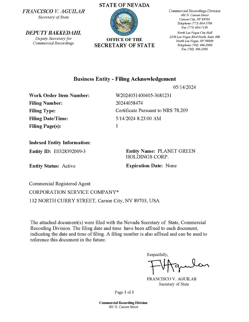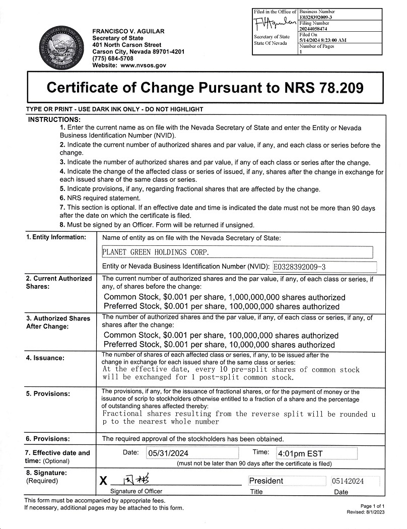 EX-3.1 2 ea020606301ex3-1_planet.htm CERTIFICATE OF CHANGE
