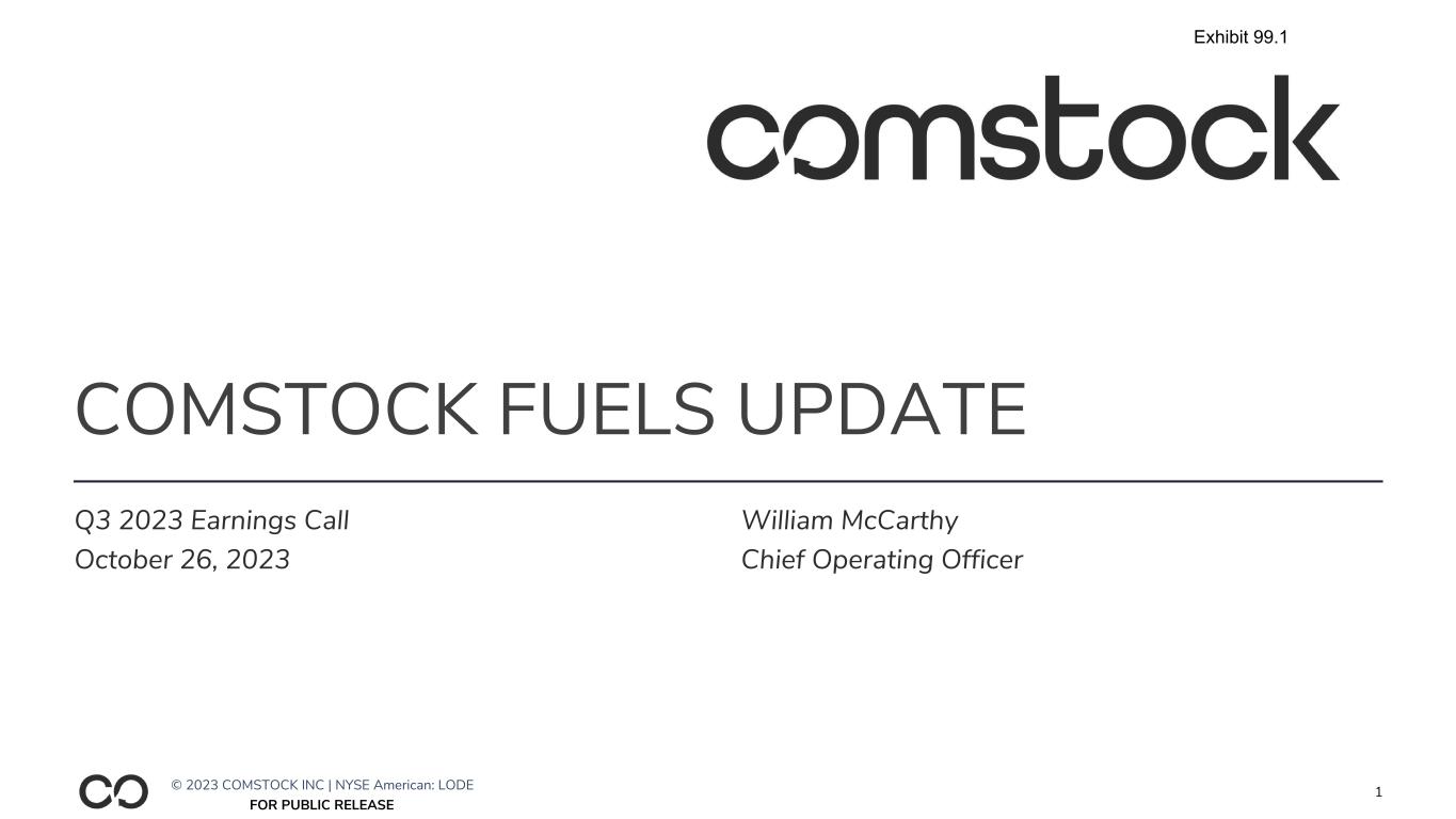 1© 2023 COMSTOCK INC | NYSE American: LODE FOR PUBLIC RELEASE COMSTOCK FUELS UPDATE Q3 2023 Earnings Call October 26, 2023 William McCarthy Chief Operating Officer Exhibit 99.1