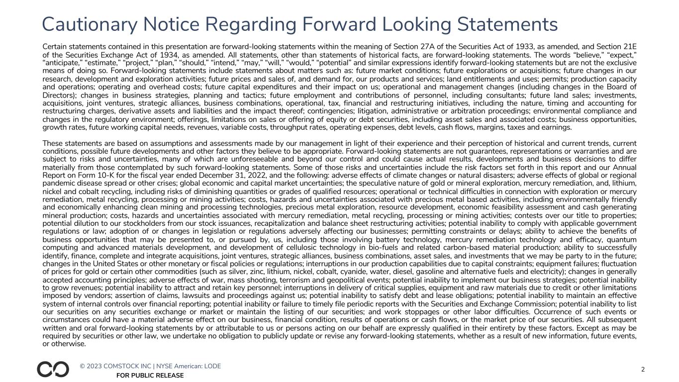 2© 2023 COMSTOCK INC | NYSE American: LODE FOR PUBLIC RELEASE Certain statements contained in this presentation are forward-looking statements within the meaning of Section 27A of the Securities Act of 1933, as amended, and Section 21E of the Securities Exchange Act of 1934, as amended. All statements, other than statements of historical facts, are forward-looking statements. The words “believe,” “expect,” “anticipate,” “estimate,” “project,” “plan,” “should,” “intend,” “may,” “will,” “would,” “potential” and similar expressions identify forward-looking statements but are not the exclusive means of doing so. Forward-looking statements include statements about matters such as: future market conditions; future explorations or acquisitions; future changes in our research, development and exploration activities; future prices and sales of, and demand for, our products and services; land entitlements and uses; permits; production capacity and operations; operating and overhead costs; future capital expenditures and their impact on us; operational and management changes (including changes in the Board of Directors); changes in business strategies, planning and tactics; future employment and contributions of personnel, including consultants; future land sales; investments, acquisitions, joint ventures, strategic alliances, business combinations, operational, tax, financial and restructuring initiatives, including the nature, timing and accounting for restructuring charges, derivative assets and liabilities and the impact thereof; contingencies; litigation, administrative or arbitration proceedings; environmental compliance and changes in the regulatory environment; offerings, limitations on sales or offering of equity or debt securities, including asset sales and associated costs; business opportunities, growth rates, future working capital needs, revenues, variable costs, throughput rates, operating expenses, debt levels, cash flows, margins, taxes and earnings. These statements are based on assumptions and assessments made by our management in light of their experience and their perception of historical and current trends, current conditions, possible future developments and other factors they believe to be appropriate. Forward-looking statements are not guarantees, representations or warranties and are subject to risks and uncertainties, many of which are unforeseeable and beyond our control and could cause actual results, developments and business decisions to differ materially from those contemplated by such forward-looking statements. Some of those risks and uncertainties include the risk factors set forth in this report and our Annual Report on Form 10-K for the fiscal year ended December 31, 2022, and the following: adverse effects of climate changes or natural disasters; adverse effects of global or regional pandemic disease spread or other crises; global economic and capital market uncertainties; the speculative nature of gold or mineral exploration, mercury remediation, and, lithium, nickel and cobalt recycling, including risks of diminishing quantities or grades of qualified resources; operational or technical difficulties in connection with exploration or mercury remediation, metal recycling, processing or mining activities; costs, hazards and uncertainties associated with precious metal based activities, including environmentally friendly and economically enhancing clean mining and processing technologies, precious metal exploration, resource development, economic feasibility assessment and cash generating mineral production; costs, hazards and uncertainties associated with mercury remediation, metal recycling, processing or mining activities; contests over our title to properties; potential dilution to our stockholders from our stock issuances, recapitalization and balance sheet restructuring activities; potential inability to comply with applicable government regulations or law; adoption of or changes in legislation or regulations adversely affecting our businesses; permitting constraints or delays; ability to achieve the benefits of business opportunities that may be presented to, or pursued by, us, including those involving battery technology, mercury remediation technology and efficacy, quantum computing and advanced materials development, and development of cellulosic technology in bio-fuels and related carbon-based material production; ability to successfully identify, finance, complete and integrate acquisitions, joint ventures, strategic alliances, business combinations, asset sales, and investments that we may be party to in the future; changes in the United States or other monetary or fiscal policies or regulations; interruptions in our production capabilities due to capital constraints; equipment failures; fluctuation of prices for gold or certain other commodities (such as silver, zinc, lithium, nickel, cobalt, cyanide, water, diesel, gasoline and alternative fuels and electricity); changes in generally accepted accounting principles; adverse effects of war, mass shooting, terrorism and geopolitical events; potential inability to implement our business strategies; potential inability to grow revenues; potential inability to attract and retain key personnel; interruptions in delivery of critical supplies, equipment and raw materials due to credit or other limitations imposed by vendors; assertion of claims, lawsuits and proceedings against us; potential inability to satisfy debt and lease obligations; potential inability to maintain an effective system of internal controls over financial reporting; potential inability or failure to timely file periodic reports with the Securities and Exchange Commission; potential inability to list our securities on any securities exchange or market or maintain the listing of our securities; and work stoppages or other labor difficulties. Occurrence of such events or circumstances could 