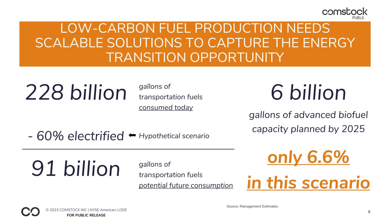 5© 2023 COMSTOCK INC | NYSE American: LODE FOR PUBLIC RELEASE LOW-CARBON FUEL PRODUCTION IS EXPANDING TO CAPTURE THE ENERGY TRANSITION OPPORTUNITY 228 billion gallons of transportation fuels consumed annually in the US1 3 billion gallons of advanced biofuels produced annually by hydro-processed fats2 6 billion gallons of advanced biofuels by 2025 capacity to double over the next 2 years3 Sources: 1 - https://www.eia.gov/dnav/pet/pet_cons_psup_dc_nus_mbbl_a.htm 2 - https://www.eia.gov/biofuels/renewable/capacity/ 3 - https://www.eia.gov/todayinenergy/detail.php?id=55399
