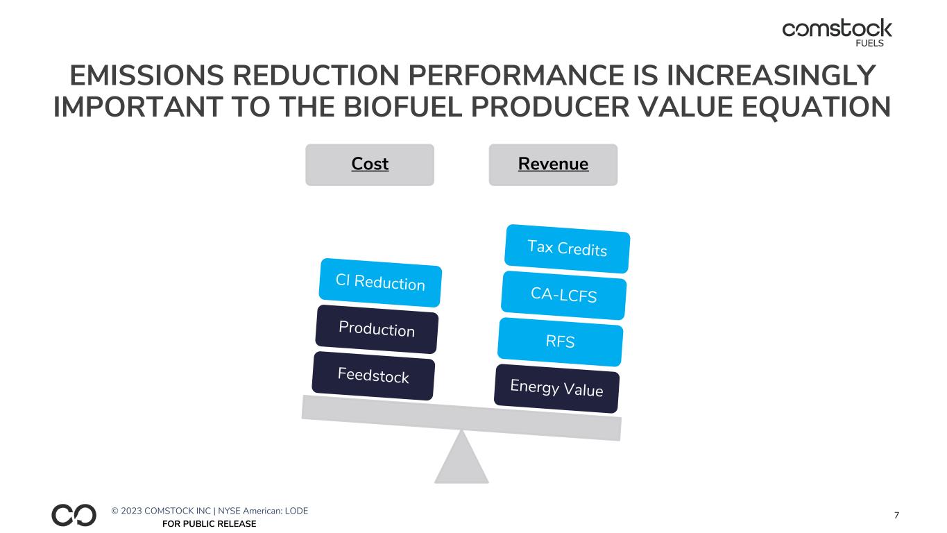 6© 2023 COMSTOCK INC | NYSE American: LODE FOR PUBLIC RELEASE LOW-CARBON FUEL PRODUCTION NEEDS SCALABLE SOLUTIONS TO CAPTURE THE ENERGY TRANSITION OPPORTUNITY 228 billion - 60% electrified 91 billion 6 billion gallons of advanced biofuel capacity planned by 2025 only 6.6% in this scenario Source: Management Estimates gallons of transportation fuels consumed today Hypothetical scenario gallons of transportation fuels potential future consumption