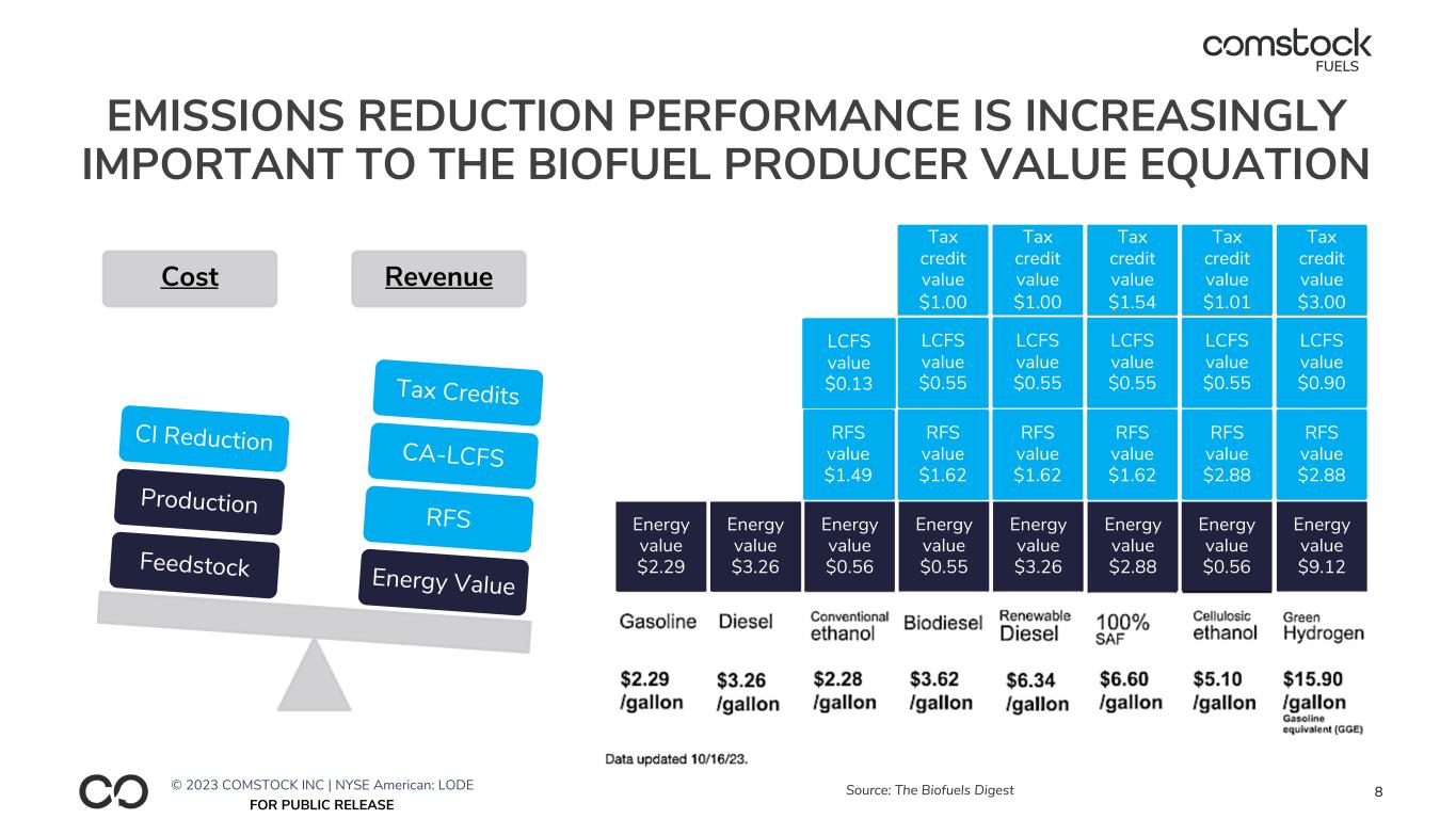 7© 2023 COMSTOCK INC | NYSE American: LODE FOR PUBLIC RELEASE EMISSIONS REDUCTION PERFORMANCE IS INCREASINGLY IMPORTANT TO THE BIOFUEL PRODUCER VALUE EQUATION Cost Revenue Energy Value RFS CA-LCFS Tax Credits Feedstock Production CI Reduction