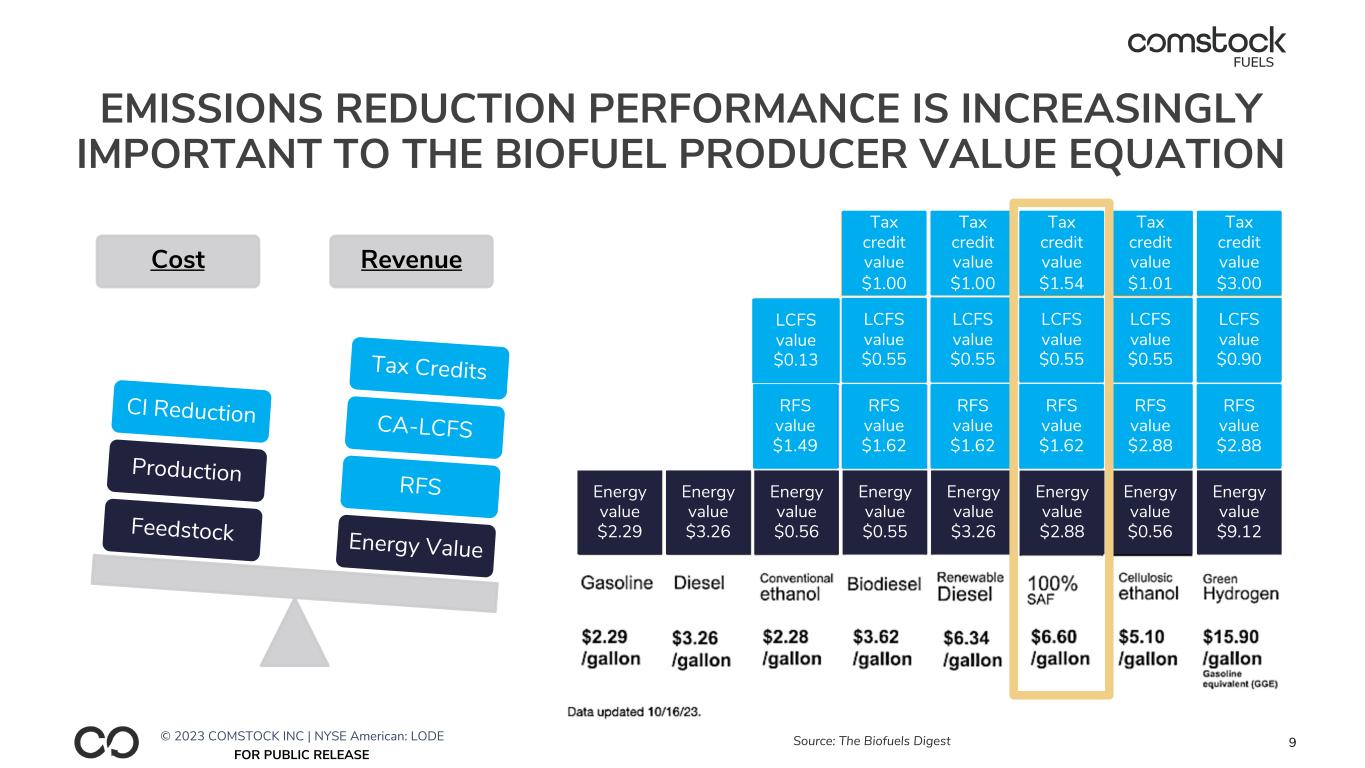 8© 2023 COMSTOCK INC | NYSE American: LODE FOR PUBLIC RELEASE EMISSIONS REDUCTION PERFORMANCE IS INCREASINGLY IMPORTANT TO THE BIOFUEL PRODUCER VALUE EQUATION Cost Revenue Energy Value RFS CA-LCFS Tax Credits Feedstock Production CI Reduction Energy value $2.29 Energy value $3.26 Energy value $0.56 Energy value $0.55 Energy value $3.26 Energy value $2.88 Energy value $0.56 Energy value $9.12 RFS value $1.49 RFS value $1.62 RFS value $1.62 RFS value $1.62 RFS value $2.88 RFS value $2.88 LCFS value $0.13 LCFS value $0.55 LCFS value $0.55 LCFS value $0.55 LCFS value $0.55 LCFS value $0.90 Tax credit value $1.00 Tax credit value $1.00 Tax credit value $1.54 Tax credit value $1.01 Tax credit value $3.00 Source: The Biofuels Digest