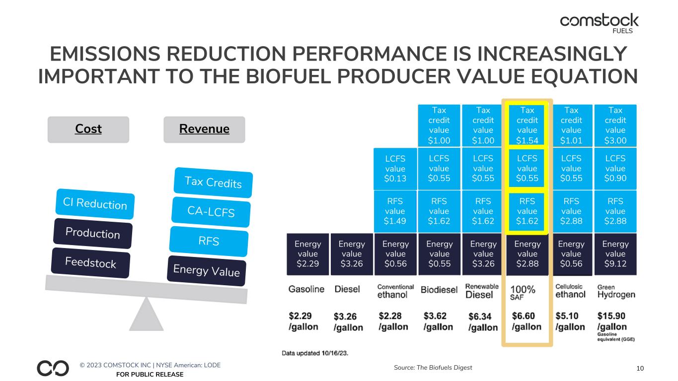 9© 2023 COMSTOCK INC | NYSE American: LODE FOR PUBLIC RELEASE Energy value $2.29 Energy value $3.26 Energy value $0.56 Energy value $0.55 Energy value $3.26 Energy value $2.88 Energy value $0.56 Energy value $9.12 RFS value $1.49 RFS value $1.62 RFS value $1.62 RFS value $1.62 RFS value $2.88 RFS value $2.88 LCFS value $0.13 LCFS value $0.55 LCFS value $0.55 LCFS value $0.55 LCFS value $0.55 LCFS value $0.90 Tax credit value $1.00 Tax credit value $1.00 Tax credit value $1.54 Tax credit value $1.01 Tax credit value $3.00 EMISSIONS REDUCTION PERFORMANCE IS INCREASINGLY IMPORTANT TO THE BIOFUEL PRODUCER VALUE EQUATION Cost Revenue Energy Value RFS CA-LCFS Tax Credits Feedstock Production CI Reduction Source: The Biofuels Digest