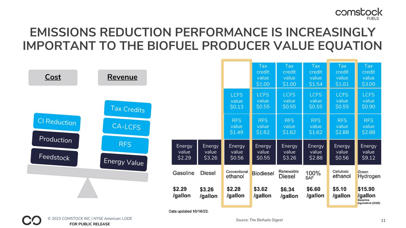 10© 2023 COMSTOCK INC | NYSE American: LODE FOR PUBLIC RELEASE Energy value $2.29 Energy value $3.26 Energy value $0.56 Energy value $0.55 Energy value $3.26 Energy value $2.88 Energy value $0.56 Energy value $9.12 RFS value $1.49 RFS value $1.62 RFS value $1.62 RFS value $1.62 RFS value $2.88 RFS value $2.88 LCFS value $0.13 LCFS value $0.55 LCFS value $0.55 LCFS value $0.55 LCFS value $0.55 LCFS value $0.90 Tax credit value $1.00 Tax credit value $1.00 Tax credit value $1.54 Tax credit value $1.01 Tax credit value $3.00 EMISSIONS REDUCTION PERFORMANCE IS INCREASINGLY IMPORTANT TO THE BIOFUEL PRODUCER VALUE EQUATION Cost Revenue Energy Value RFS CA-LCFS Tax Credits Feedstock Production CI Reduction Source: The Biofuels Digest