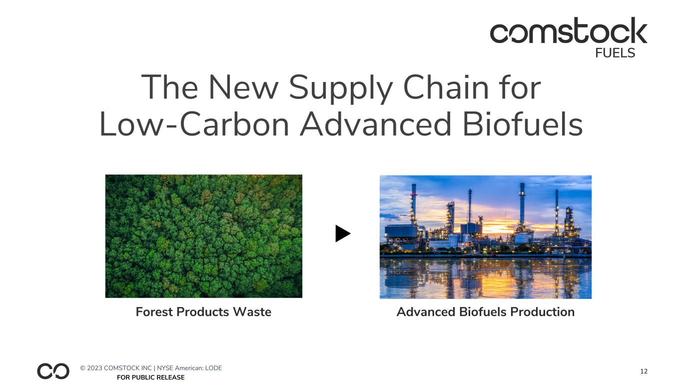 11© 2023 COMSTOCK INC | NYSE American: LODE FOR PUBLIC RELEASE Energy value $2.29 Energy value $3.26 Energy value $0.56 Energy value $0.55 Energy value $3.26 Energy value $2.88 Energy value $0.56 Energy value $9.12 RFS value $1.49 RFS value $1.62 RFS value $1.62 RFS value $1.62 RFS value $2.88 RFS value $2.88 LCFS value $0.13 LCFS value $0.55 LCFS value $0.55 LCFS value $0.55 LCFS value $0.55 LCFS value $0.90 Tax credit value $1.00 Tax credit value $1.00 Tax credit value $1.54 Tax credit value $1.01 Tax credit value $3.00 EMISSIONS REDUCTION PERFORMANCE IS INCREASINGLY IMPORTANT TO THE BIOFUEL PRODUCER VALUE EQUATION Cost Revenue Energy Value RFS CA-LCFS Tax Credits Feedstock Production CI Reduction Source: The Biofuels Digest