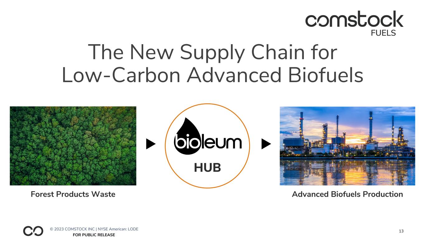 12© 2023 COMSTOCK INC | NYSE American: LODE FOR PUBLIC RELEASE The New Supply Chain for Low-Carbon Advanced Biofuels Forest Products Waste Advanced Biofuels Production