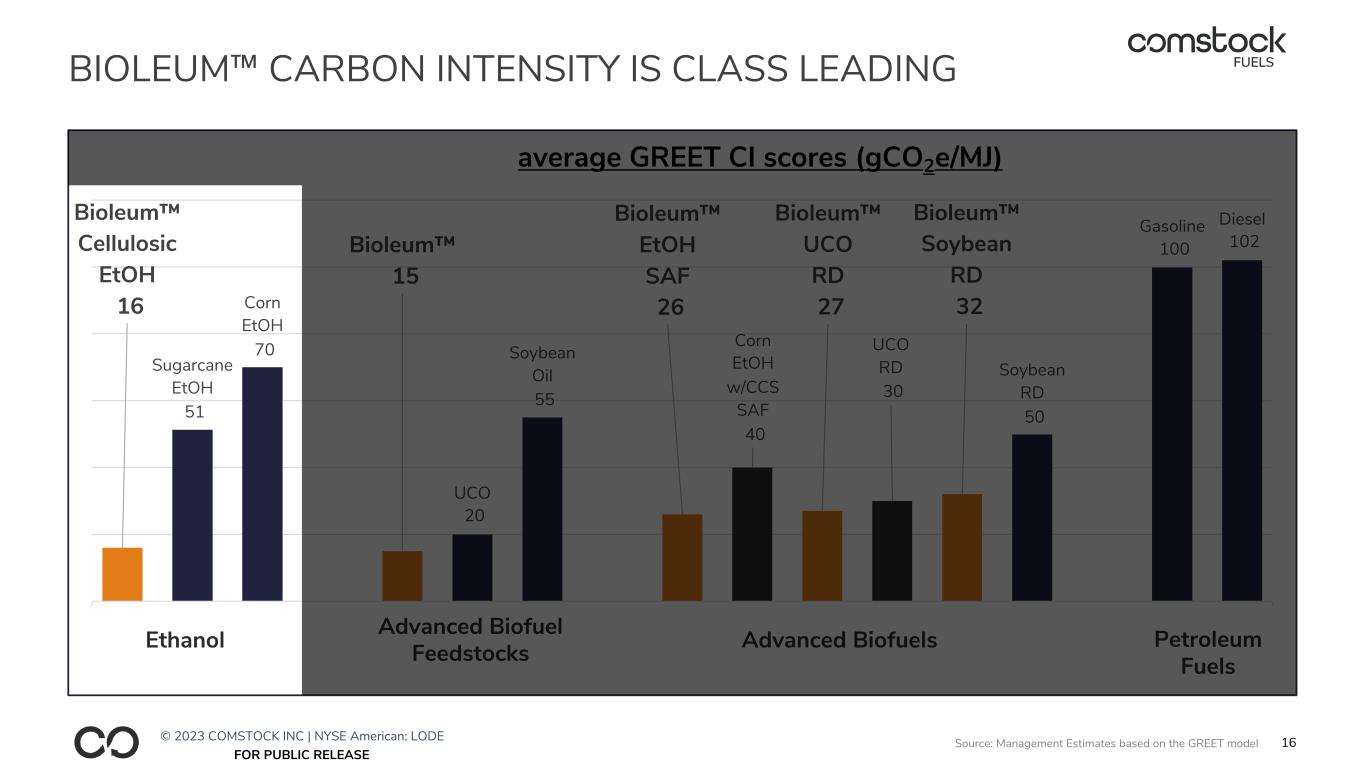 15© 2023 COMSTOCK INC | NYSE American: LODE FOR PUBLIC RELEASE BIOLEUM™ CARBON INTENSITY IS CLASS LEADING Source: Management Estimates based on the GREET model Ethanol Advanced Biofuel Feedstocks Advanced Biofuels Petroleum Fuels Bioleum™ Cellulosic EtOH 16 Sugarcane EtOH 51 Corn EtOH 70 Bioleum™ 15 UCO 20 Soybean Oil 55 Bioleum™ EtOH SAF 26 Corn EtOH w/CCS SAF 40 Bioleum™ UCO RD 27 UCO RD 30 Bioleum™ Soybean RD 32 Soybean RD 50 Gasoline 100 Diesel 102 average GREET CI scores (gCO2e/MJ)