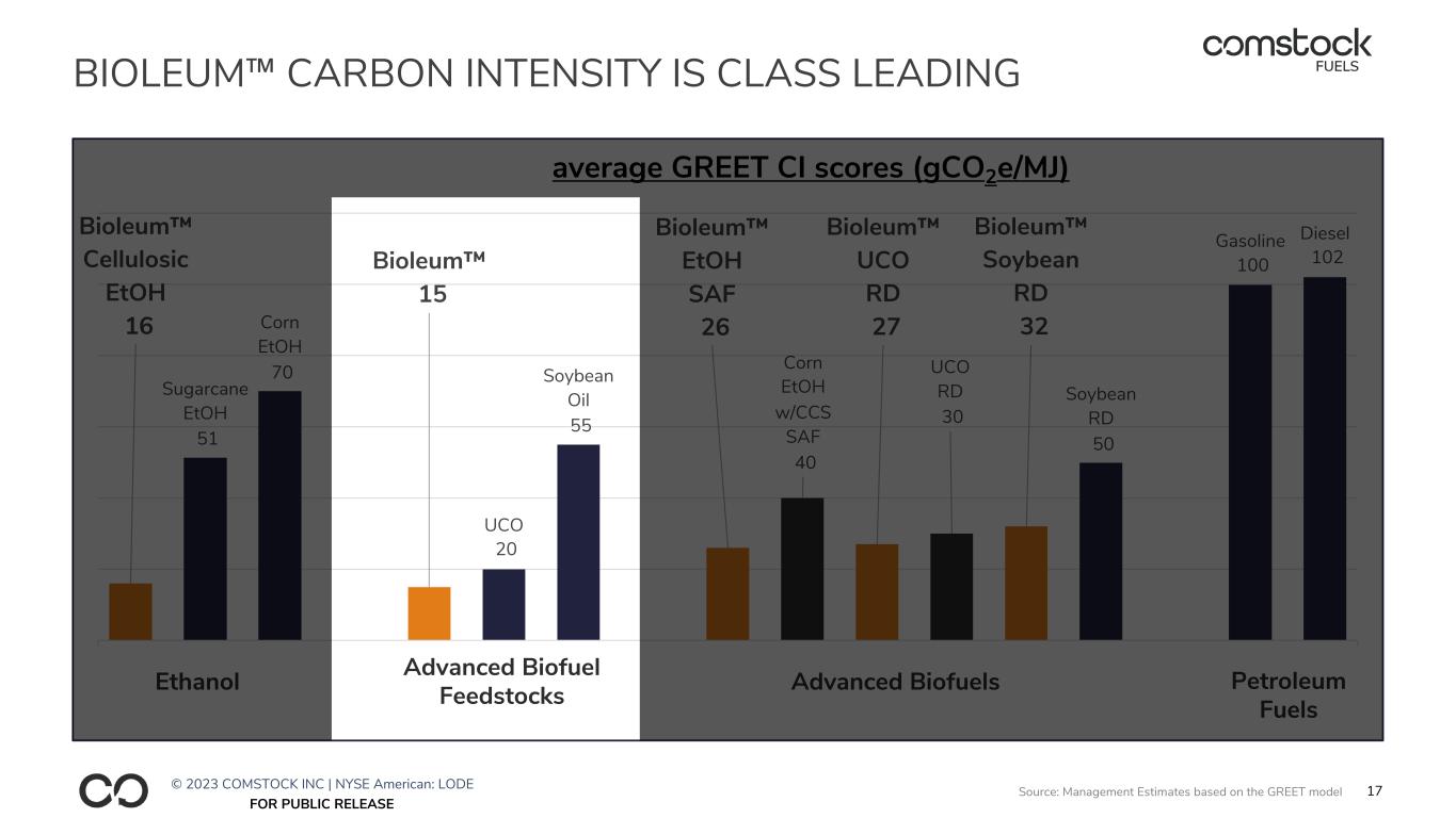 16© 2023 COMSTOCK INC | NYSE American: LODE FOR PUBLIC RELEASE Bioleum™ Cellulosic EtOH 16 Sugarcane EtOH 51 Corn EtOH 70 Bioleum™ 15 UCO 20 Soybean Oil 55 Bioleum™ EtOH SAF 26 Corn EtOH w/CCS SAF 40 Bioleum™ UCO RD 27 UCO RD 30 Bioleum™ Soybean RD 32 Soybean RD 50 Gasoline 100 Diesel 102 average GREET CI scores (gCO2e/MJ) BIOLEUM™ CARBON INTENSITY IS CLASS LEADING Source: Management Estimates based on the GREET model Ethanol Advanced Biofuel Feedstocks Advanced Biofuels Petroleum Fuels