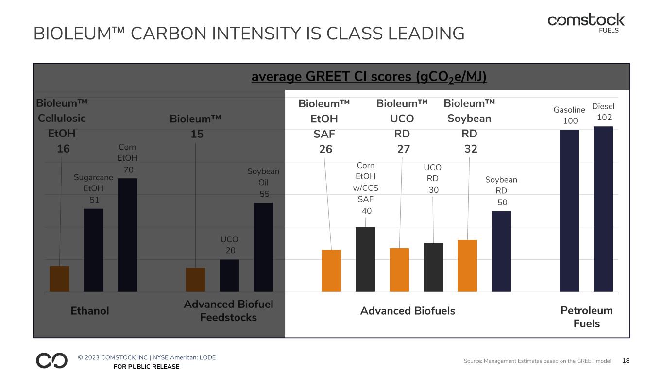 17© 2023 COMSTOCK INC | NYSE American: LODE FOR PUBLIC RELEASE Bioleum™ Cellulosic EtOH 16 Sugarcane EtOH 51 Corn EtOH 70 Bioleum™ 15 UCO 20 Soybean Oil 55 Bioleum™ EtOH SAF 26 Corn EtOH w/CCS SAF 40 Bioleum™ UCO RD 27 UCO RD 30 Bioleum™ Soybean RD 32 Soybean RD 50 Gasoline 100 Diesel 102 average GREET CI scores (gCO2e/MJ) BIOLEUM™ CARBON INTENSITY IS CLASS LEADING Source: Management Estimates based on the GREET model Ethanol Advanced Biofuel Feedstocks Advanced Biofuels Petroleum Fuels