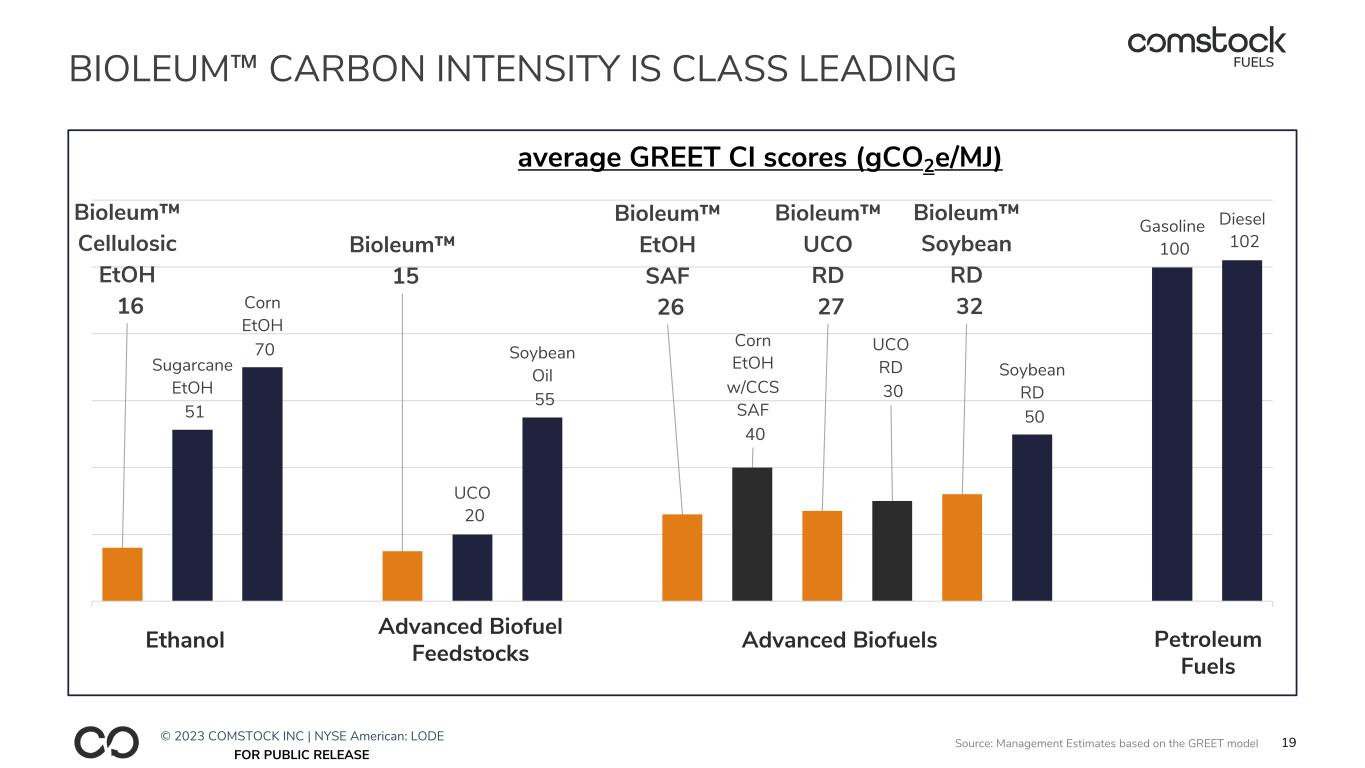18© 2023 COMSTOCK INC | NYSE American: LODE FOR PUBLIC RELEASE Bioleum™ Cellulosic EtOH 16 Sugarcane EtOH 51 Corn EtOH 70 Bioleum™ 15 UCO 20 Soybean Oil 55 Bioleum™ EtOH SAF 26 Corn EtOH w/CCS SAF 40 Bioleum™ UCO RD 27 UCO RD 30 Bioleum™ Soybean RD 32 Soybean RD 50 Gasoline 100 Diesel 102 average GREET CI scores (gCO2e/MJ) BIOLEUM™ CARBON INTENSITY IS CLASS LEADING Source: Management Estimates based on the GREET model Ethanol Advanced Biofuel Feedstocks Advanced Biofuels Petroleum Fuels