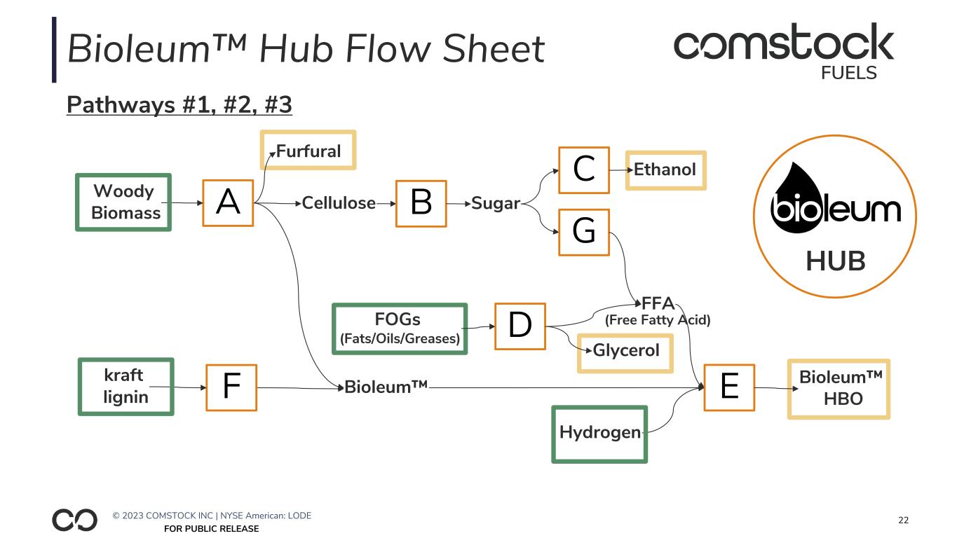 21© 2023 COMSTOCK INC | NYSE American: LODE FOR PUBLIC RELEASE Supply Chain Flow SAF = Sustainable Aviation Fuel RD = Renewable Diesel HBO-C = Hydrodeoxygenated Bioleum Oil - Crude ETJ Refinery RD Refinery Chemical Manufacturing Ethanol Bioleum™ HBO Furfural & Glycerol HUB SAF SAF & RD Green Chemicals Forest Products Waste FOGs (Fats/Oils/Greases) Hydrogen