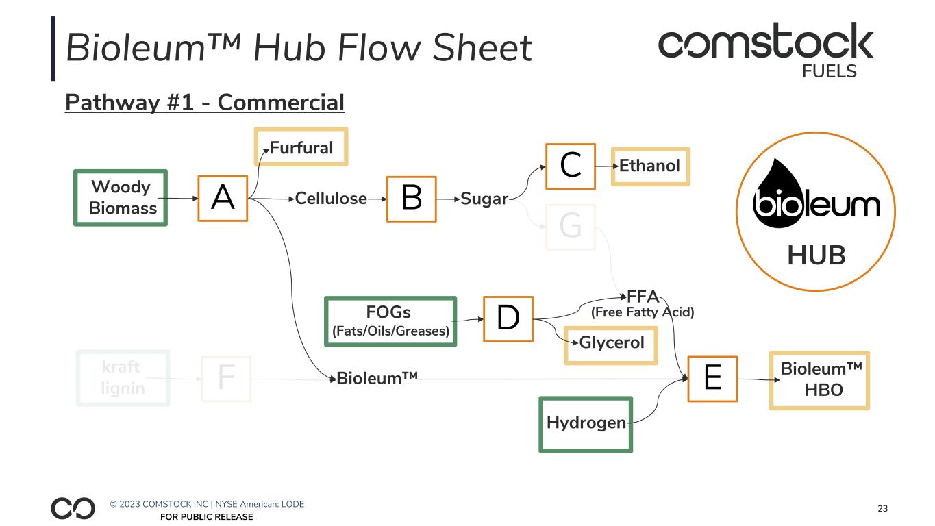 22© 2023 COMSTOCK INC | NYSE American: LODE FOR PUBLIC RELEASE Bioleum™ Hub Flow Sheet HUB Woody Biomass Cellulose Bioleum™ Furfural kraft lignin Sugar Ethanol FFA Bioleum™ HBO A B C G E D Glycerol F Hydrogen Pathways #1, #2, #3 (Free Fatty Acid)FOGs (Fats/Oils/Greases)