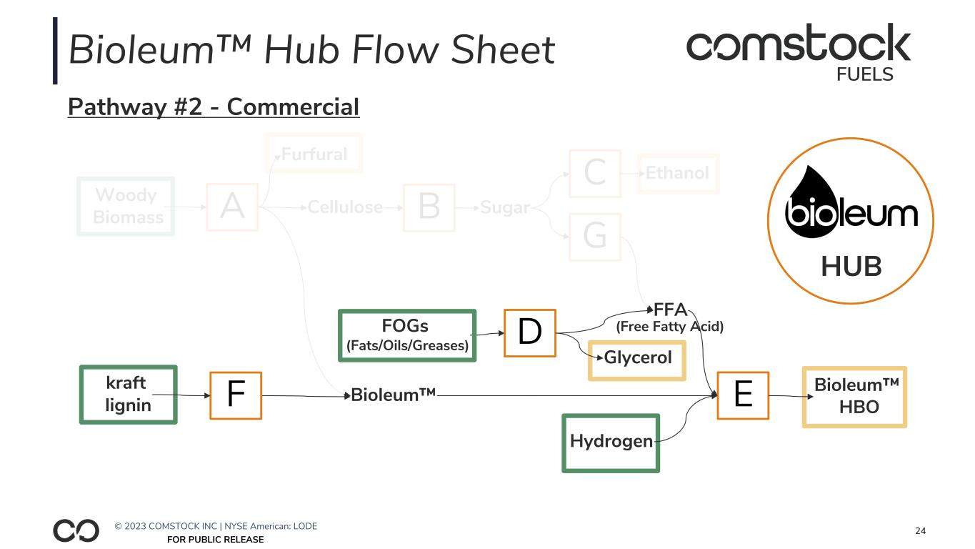 23© 2023 COMSTOCK INC | NYSE American: LODE FOR PUBLIC RELEASE Bioleum™ Hub Flow Sheet HUB Woody Biomass Cellulose Bioleum™ Furfural kraft lignin Sugar Ethanol FFA Bioleum™ HBO A B C G E D Glycerol F Hydrogen Pathway #1 - Commercial (Free Fatty Acid)FOGs (Fats/Oils/Greases)
