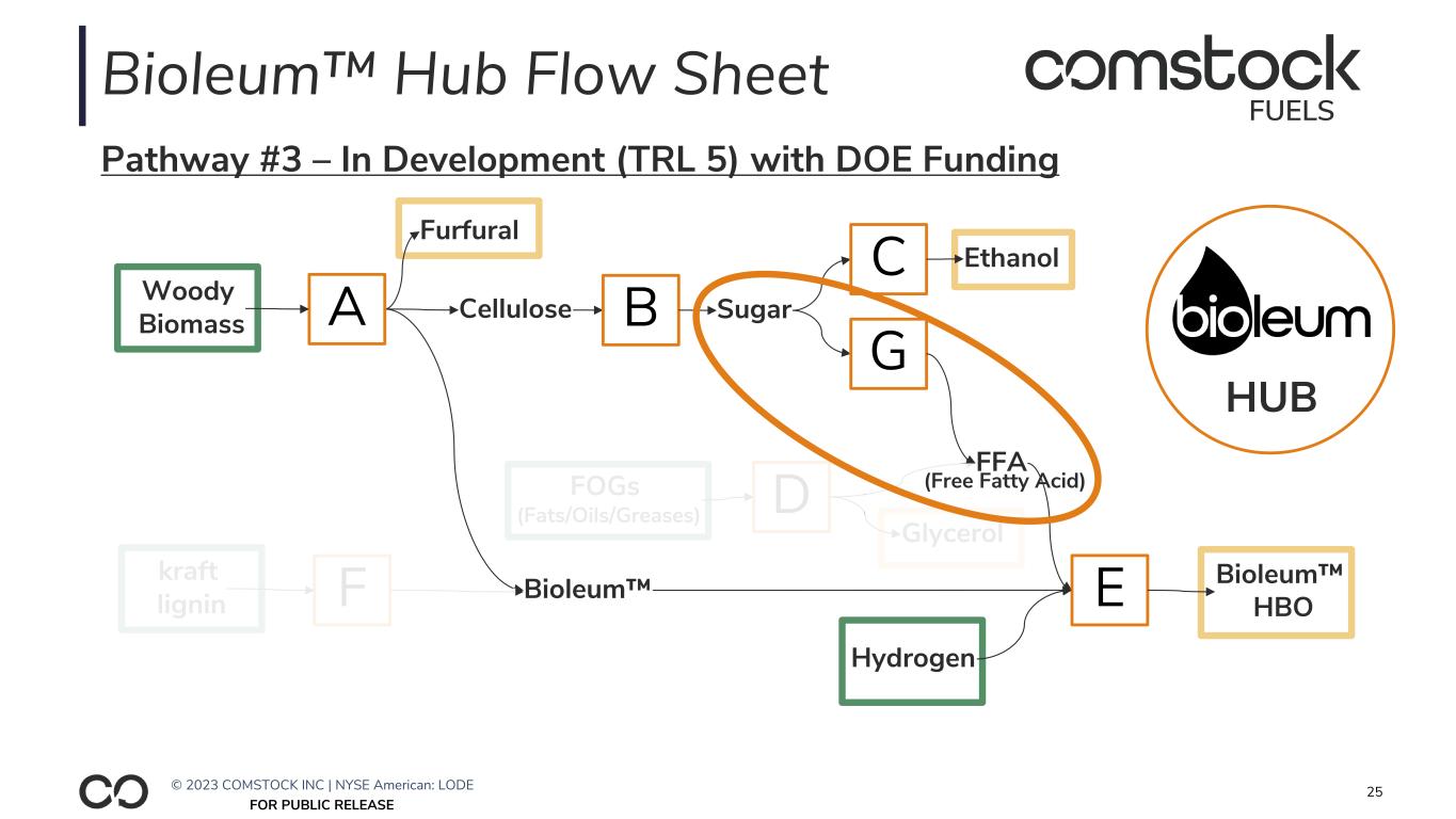 24© 2023 COMSTOCK INC | NYSE American: LODE FOR PUBLIC RELEASE Bioleum™ Hub Flow Sheet HUB Woody Biomass Cellulose Bioleum™ Furfural kraft lignin Sugar Ethanol FFA Bioleum™ HBO A B C G E D Glycerol F Hydrogen Pathway #2 - Commercial (Free Fatty Acid)FOGs (Fats/Oils/Greases)