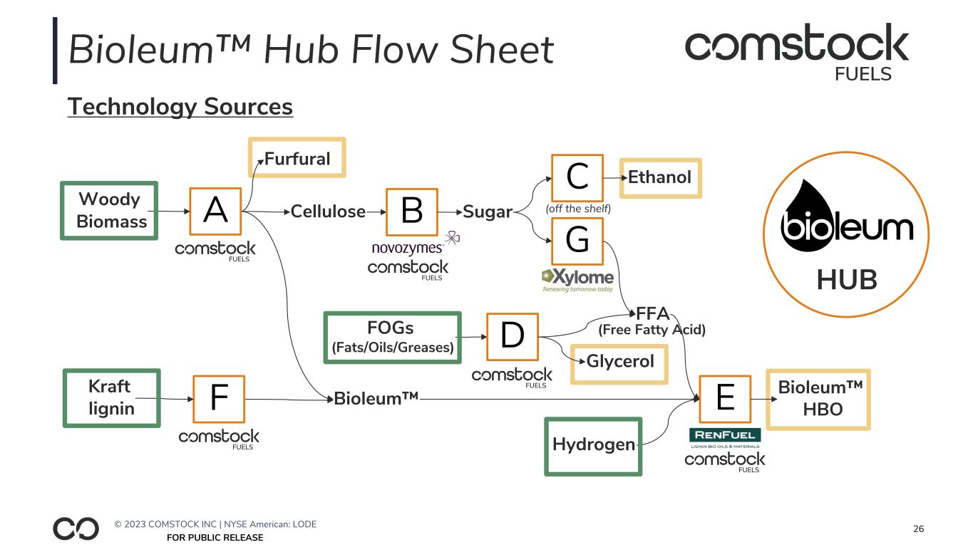 25© 2023 COMSTOCK INC | NYSE American: LODE FOR PUBLIC RELEASE FOGs (Fats/Oils/Greases) Bioleum™ Hub Flow Sheet HUB Woody Biomass Cellulose Bioleum™ Furfural kraft lignin Sugar Ethanol FFA Bioleum™ HBO A B C G E D Glycerol F Hydrogen Pathway #3 – In Development (TRL 5) with DOE Funding (Free Fatty Acid)