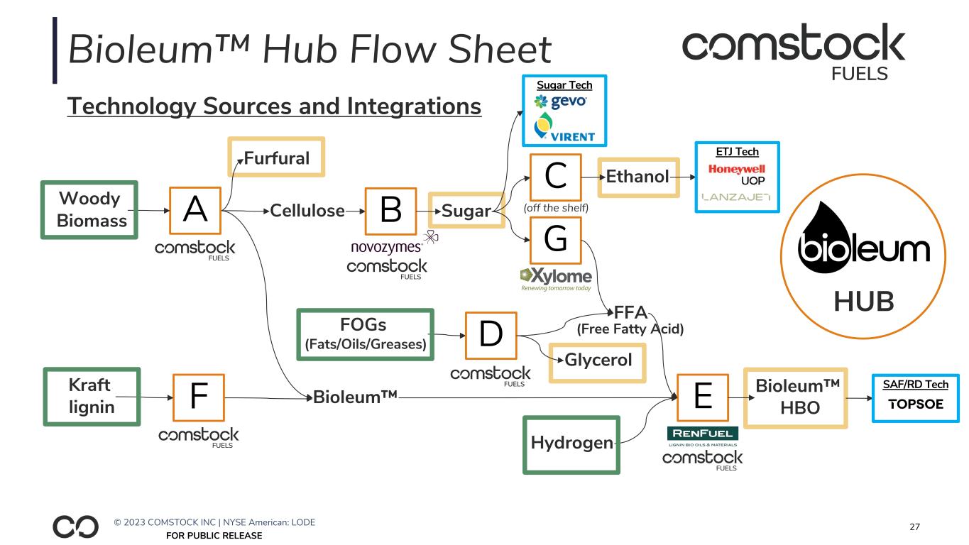 26© 2023 COMSTOCK INC | NYSE American: LODE FOR PUBLIC RELEASE Bioleum™ Hub Flow Sheet HUB Woody Biomass Cellulose Bioleum™ Furfural Kraft lignin Sugar Ethanol FFA Bioleum™ HBO A B C G E D Glycerol F Hydrogen Technology Sources (Free Fatty Acid)FOGs (Fats/Oils/Greases) (off the shelf)