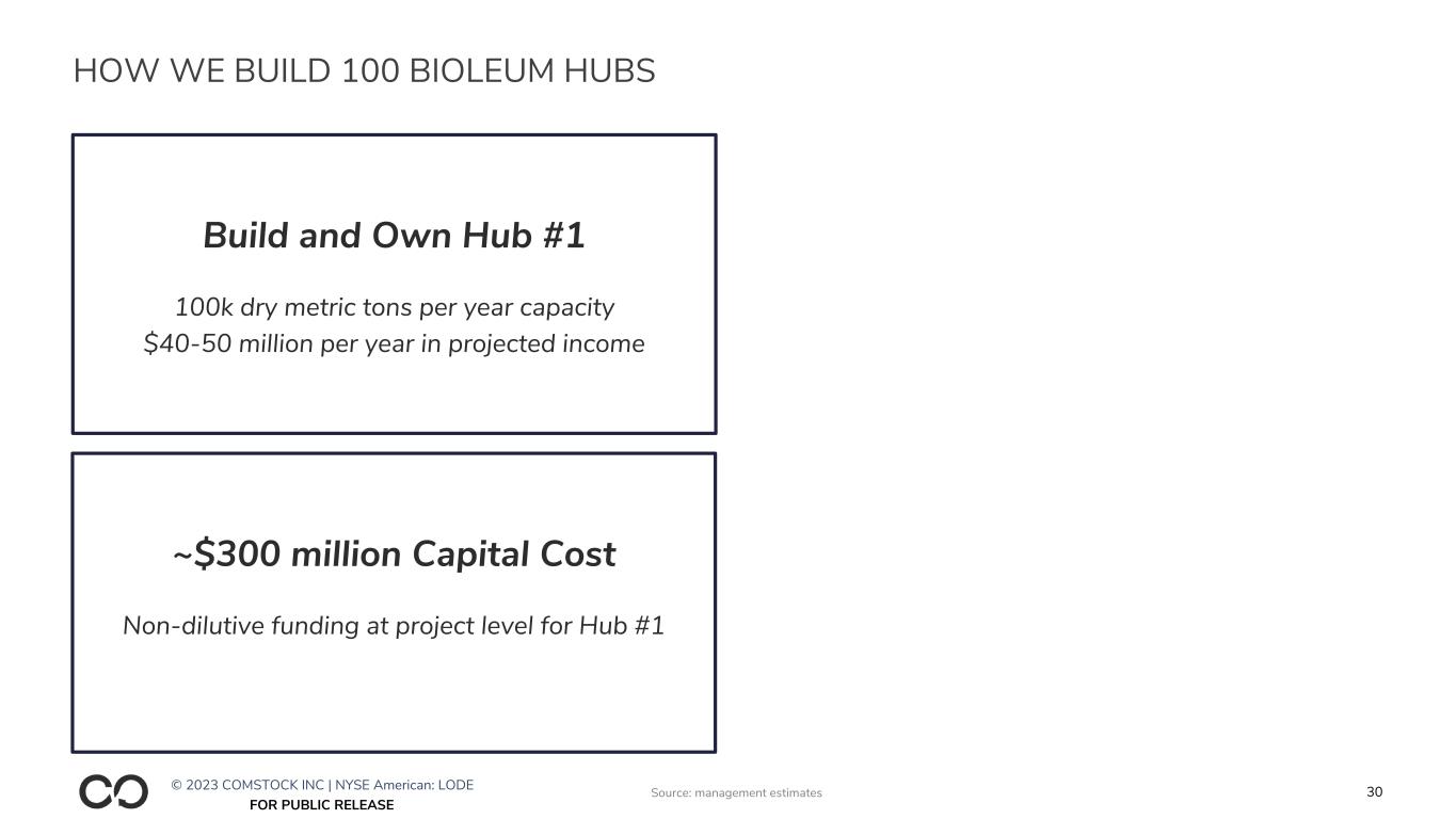 29© 2023 COMSTOCK INC | NYSE American: LODE FOR PUBLIC RELEASE HOW WE BUILD 100 BIOLEUM HUBS Build and Own Hub #1 100k dry metric tons per year capacity $40-50 million per year in projected income Source: management estimates