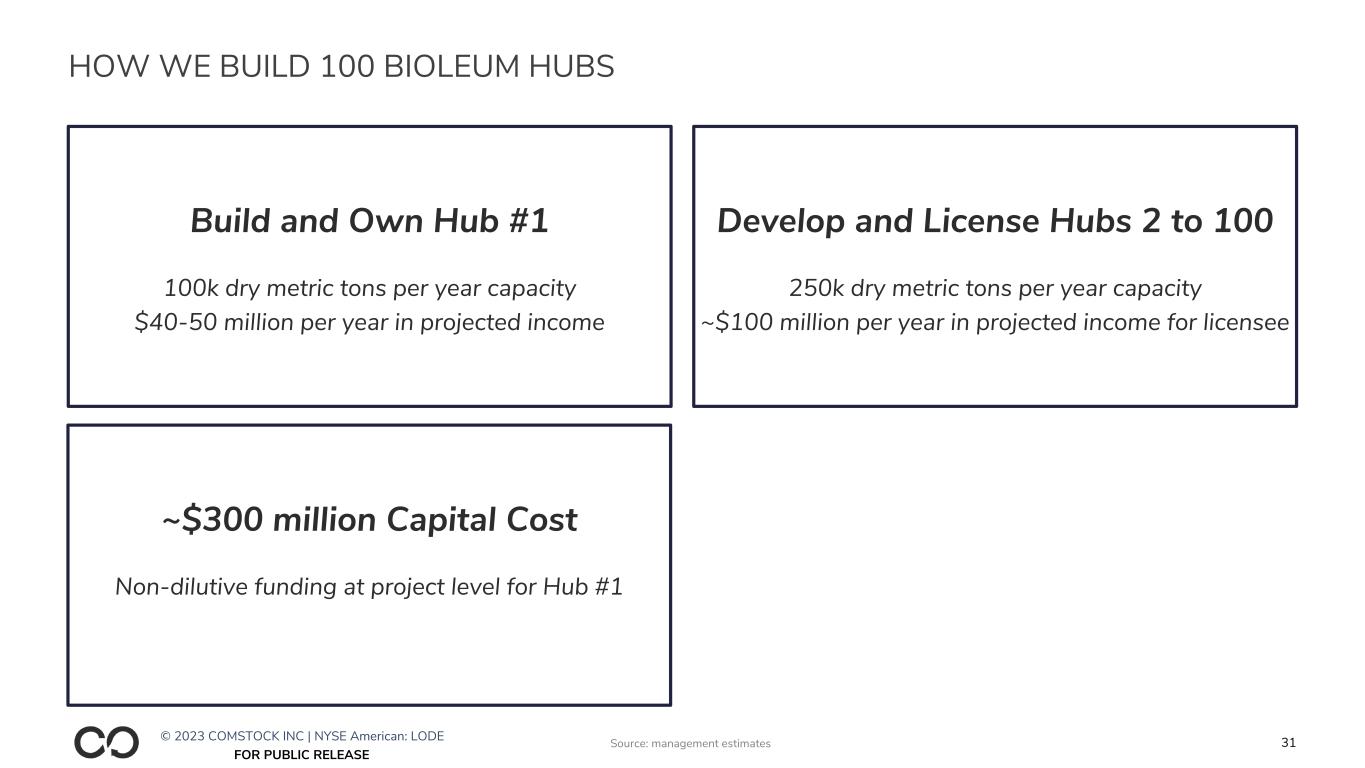 30© 2023 COMSTOCK INC | NYSE American: LODE FOR PUBLIC RELEASE HOW WE BUILD 100 BIOLEUM HUBS Build and Own Hub #1 100k dry metric tons per year capacity $40-50 million per year in projected income ~$300 million Capital Cost Non-dilutive funding at project level for Hub #1 Source: management estimates