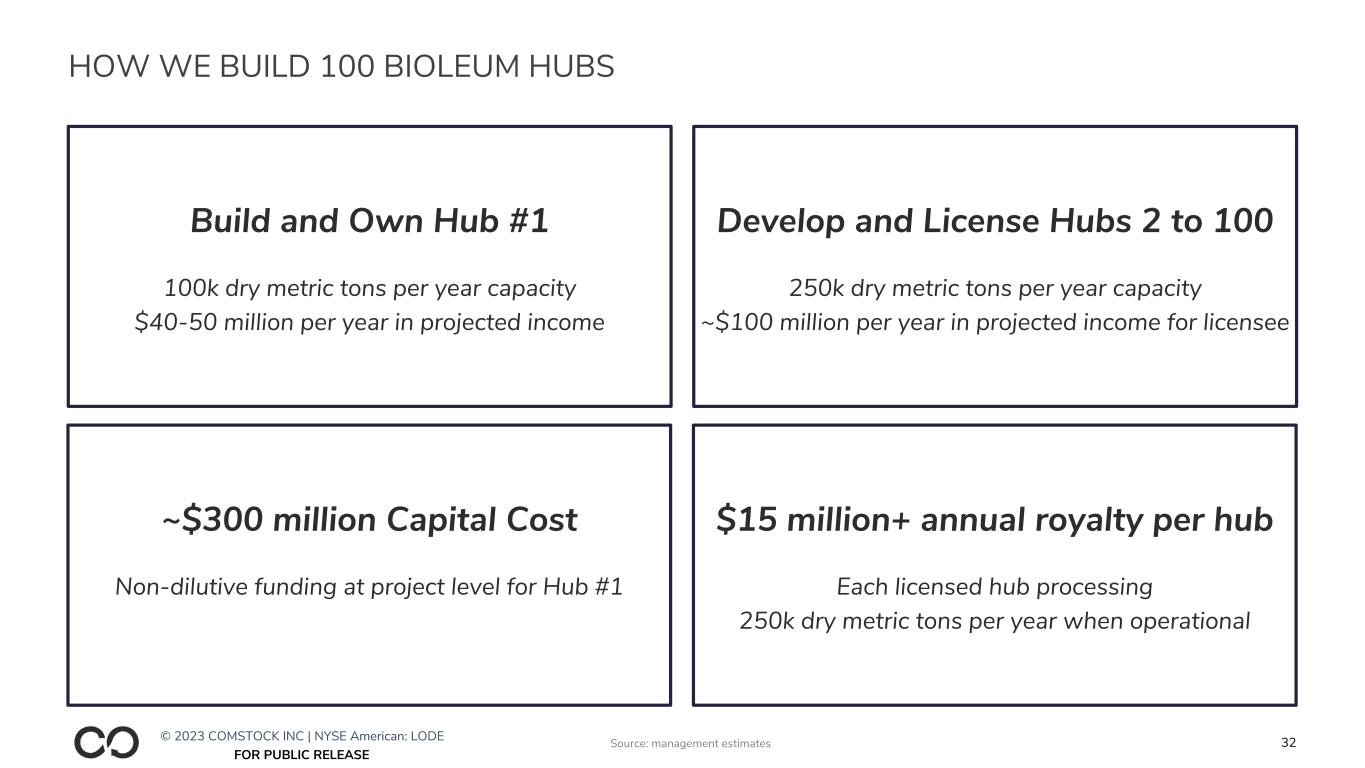 31© 2023 COMSTOCK INC | NYSE American: LODE FOR PUBLIC RELEASE HOW WE BUILD 100 BIOLEUM HUBS Build and Own Hub #1 100k dry metric tons per year capacity $40-50 million per year in projected income Develop and License Hubs 2 to 100 250k dry metric tons per year capacity ~$100 million per year in projected income for licensee ~$300 million Capital Cost Non-dilutive funding at project level for Hub #1 Source: management estimates