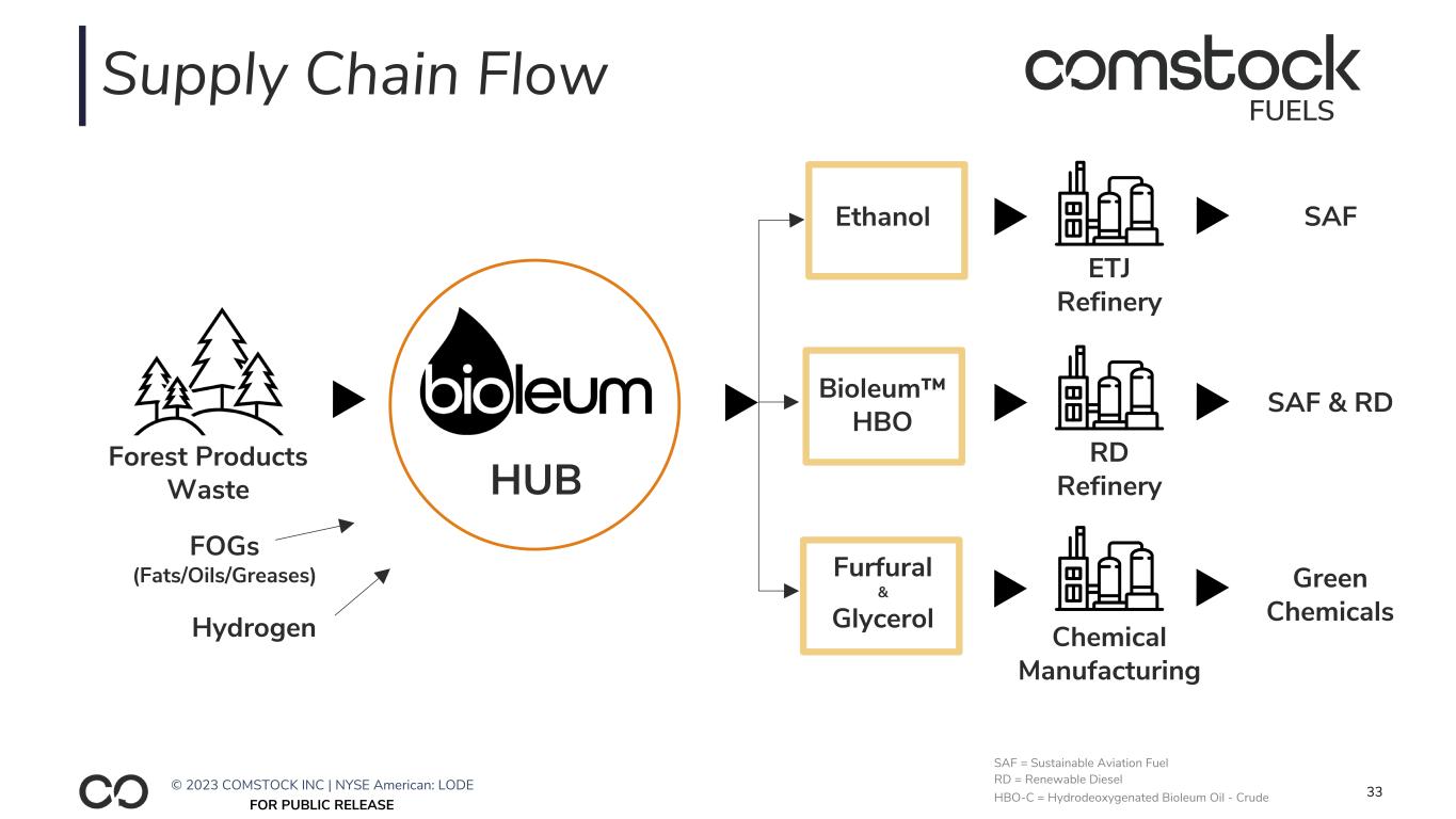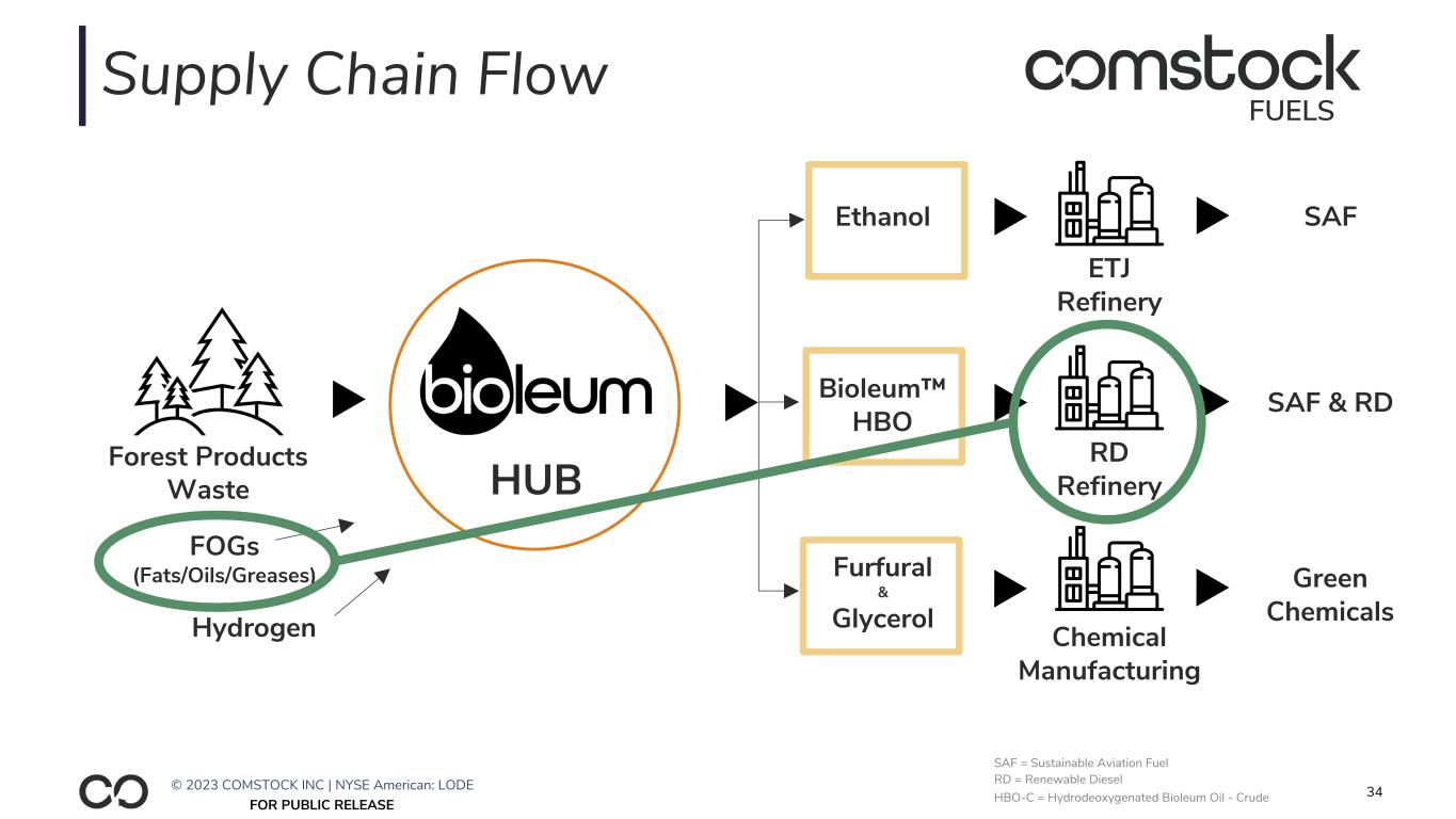 33© 2023 COMSTOCK INC | NYSE American: LODE FOR PUBLIC RELEASE Supply Chain Flow SAF = Sustainable Aviation Fuel RD = Renewable Diesel HBO-C = Hydrodeoxygenated Bioleum Oil - Crude ETJ Refinery RD Refinery Chemical Manufacturing Ethanol Bioleum™ HBO Furfural & Glycerol HUB SAF SAF & RD Green Chemicals Forest Products Waste FOGs (Fats/Oils/Greases) Hydrogen