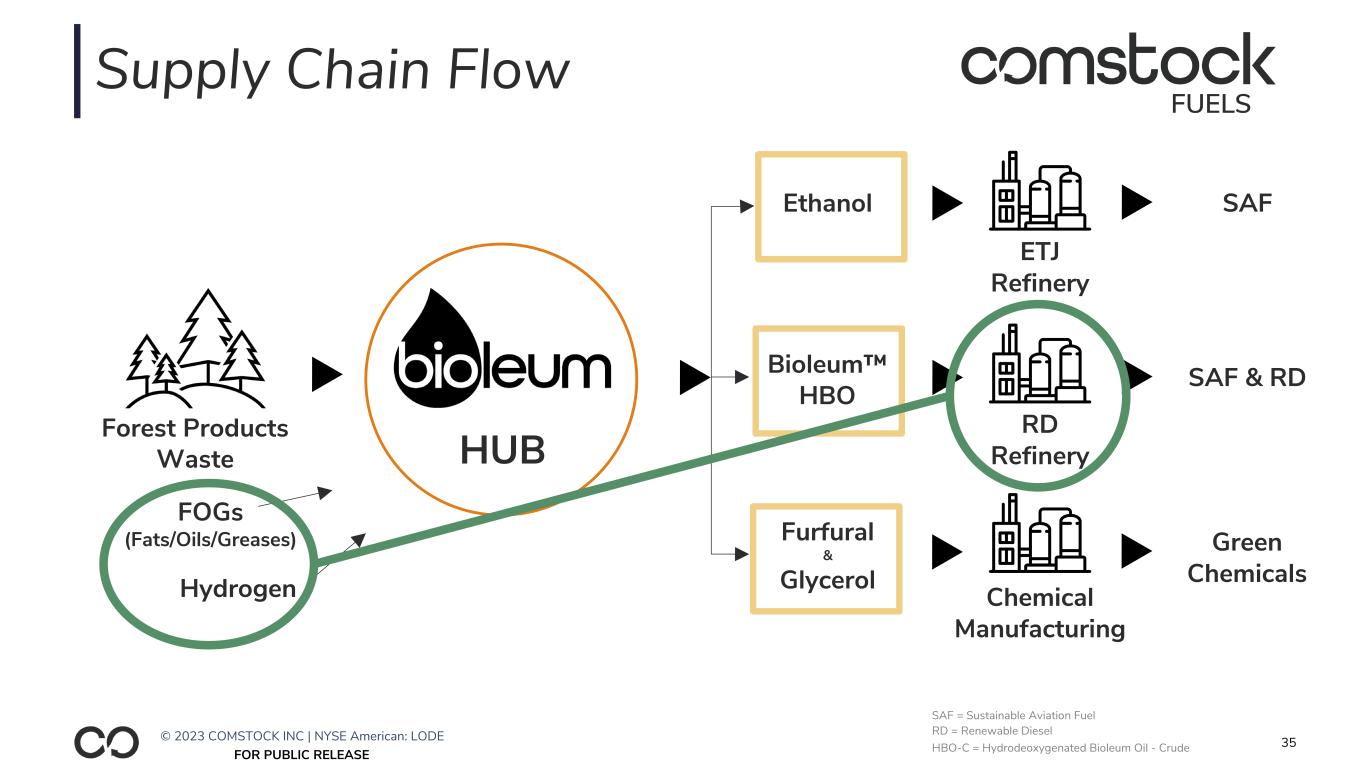 34© 2023 COMSTOCK INC | NYSE American: LODE FOR PUBLIC RELEASE Supply Chain Flow SAF = Sustainable Aviation Fuel RD = Renewable Diesel HBO-C = Hydrodeoxygenated Bioleum Oil - Crude ETJ Refinery RD Refinery Chemical Manufacturing Ethanol Bioleum™ HBO Furfural & Glycerol HUB SAF SAF & RD Green Chemicals Forest Products Waste FOGs (Fats/Oils/Greases) Hydrogen