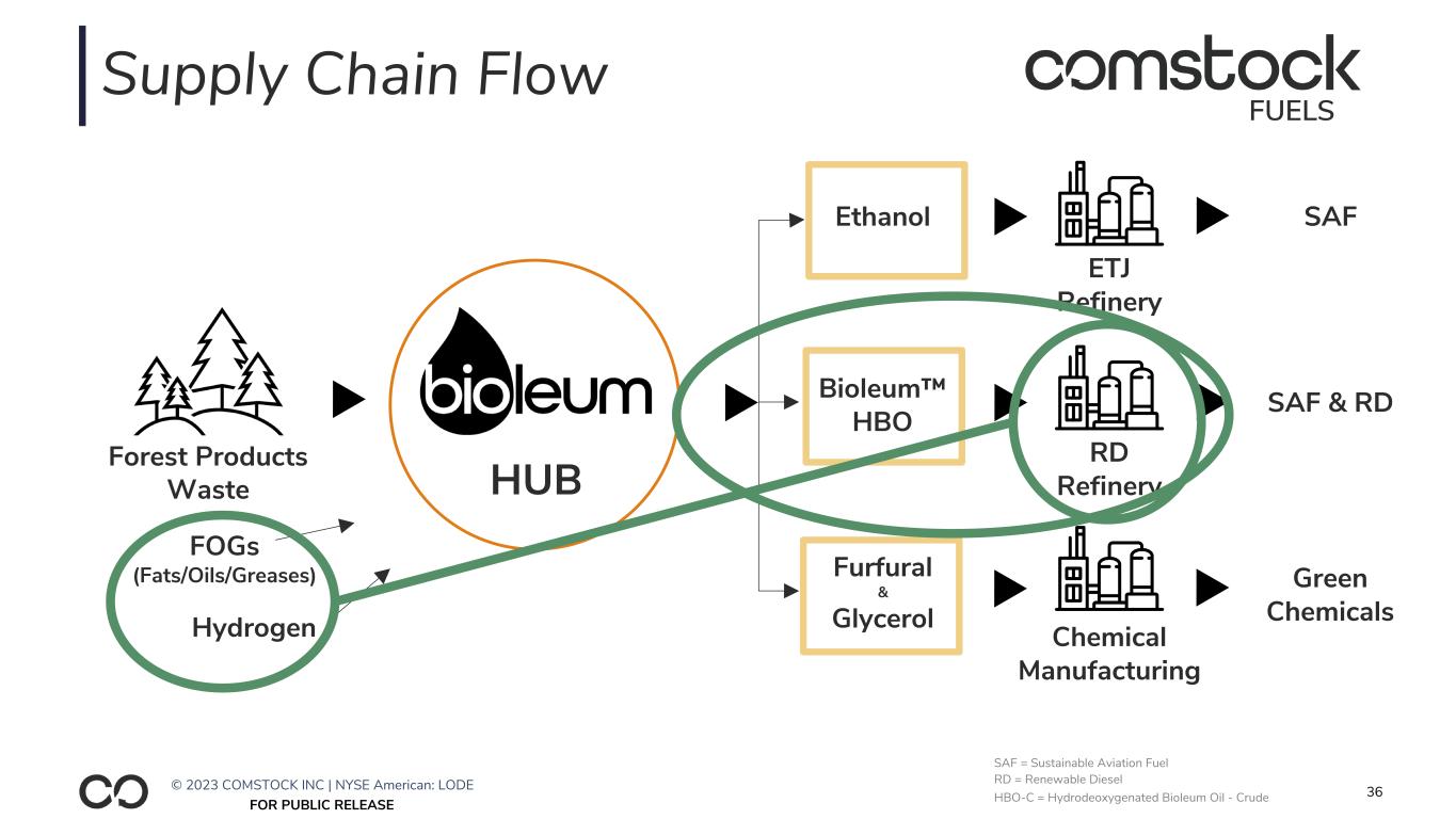 35© 2023 COMSTOCK INC | NYSE American: LODE FOR PUBLIC RELEASE Supply Chain Flow SAF = Sustainable Aviation Fuel RD = Renewable Diesel HBO-C = Hydrodeoxygenated Bioleum Oil - Crude ETJ Refinery RD Refinery Chemical Manufacturing Ethanol Bioleum™ HBO Furfural & Glycerol HUB SAF SAF & RD Green Chemicals Forest Products Waste FOGs (Fats/Oils/Greases) Hydrogen
