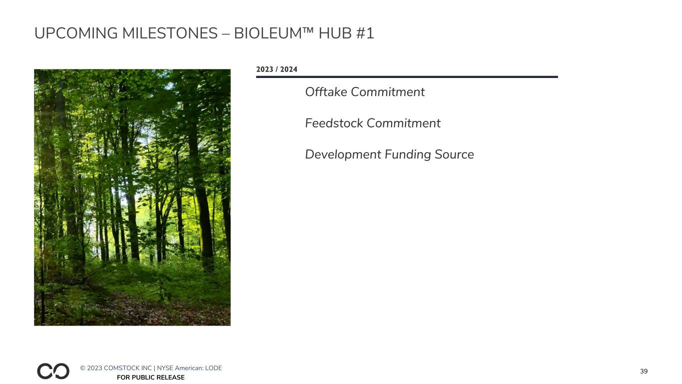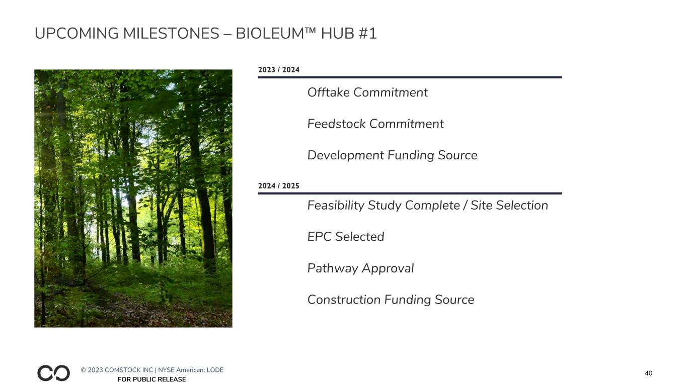 39© 2023 COMSTOCK INC | NYSE American: LODE FOR PUBLIC RELEASE UPCOMING MILESTONES – BIOLEUM™ HUB #1 Offtake Commitment Feedstock Commitment Development Funding Source 2023 / 2024