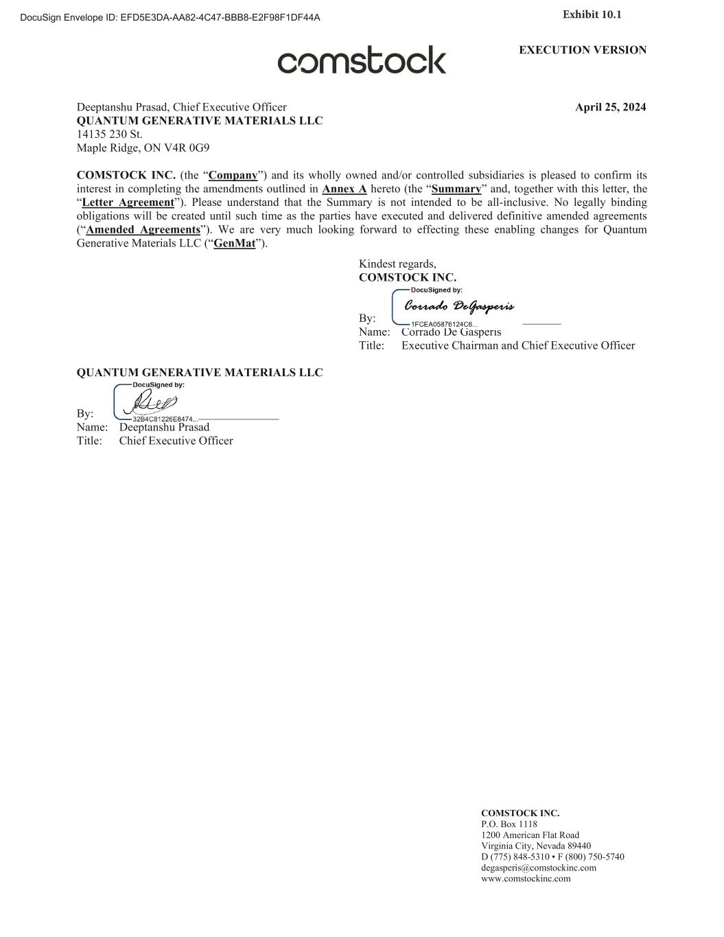 EXECUTION VERSION COMSTOCK INC. P.O. Box 1118 1200 American Flat Road Virginia City, Nevada 89440 D (775) 848-5310 • F (800) 750-5740 degasperis@comstockinc.com www.comstockinc.com Deeptanshu Prasad, Chief Executive Officer April 25, 2024 QUANTUM GENERATIVE MATERIALS LLC 14135 230 St. Maple Ridge, ON V4R 0G9 COMSTOCK INC. (the “Company”) and its wholly owned and/or controlled subsidiaries is pleased to confirm its interest in completing the amendments outlined in Annex A hereto (the “Summary” and, together with this letter, the “Letter Agreement”). Please understand that the Summary is not intended to be all-inclusive. No legally binding obligations will be created until such time as the parties have executed and delivered definitive amended agreements (“Amended Agreements”). We are very much looking forward to effecting these enabling changes for Quantum Generative Materials LLC (“GenMat”). Kindest regards, COMSTOCK INC. By: ___________________________ Name: Corrado De Gasperis Title: Executive Chairman and Chief Executive Officer QUANTUM GENERATIVE MATERIALS LLC By: ___________________________ Name: Deeptanshu Prasad Title: Chief Executive Officer Exhibit 10.1