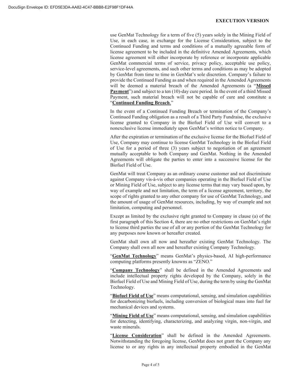 EXECUTION VERSION Page 4 of 5 use GenMat Technology for a term of five (5) years solely in the Mining Field of Use, in each case, in exchange for the License Consideration, subject to the Continued Funding and terms and conditions of a mutually agreeable form of license agreement to be included in the definitive Amended Agreements, which license agreement will either incorporate by reference or incorporate applicable GenMat commercial terms of service, privacy policy, acceptable use policy, service-level agreements, and such other terms and conditions as may be adopted by GenMat from time to time in GenMat’s sole discretion. Company’s failure to provide the Continued Funding as and when required in the Amended Agreements will be deemed a material breach of the Amended Agreements (a “Missed Payment”) and subject to a ten (10)-day cure period. In the event of a third Missed Payment, such material breach will not be capable of cure and constitute a “Continued Funding Breach.” In the event of a Continued Funding Breach or termination of the Company’s Continued Funding obligation as a result of a Third Party Fundraise, the exclusive license granted to Company in the Biofuel Field of Use will convert to a nonexclusive license immediately upon GenMat’s written notice to Company. After the expiration or termination of the exclusive license for the Biofuel Field of Use, Company may continue to license GenMat Technology in the Biofuel Field of Use for a period of three (3) years subject to negotiation of an agreement mutually acceptable to both Company and GenMat. Nothing in the Amended Agreements will obligate the parties to enter into a successive license for the Biofuel Field of Use. GenMat will treat Company as an ordinary course customer and not discriminate against Company vis-à-vis other companies operating in the Biofuel Field of Use or Mining Field of Use, subject to any license terms that may vary based upon, by way of example and not limitation, the term of a license agreement, territory, the scope of rights granted to any other company for use of GenMat Technology, and the amount of usage of GenMat resources, including, by way of example and not limitation, computing and personnel. Except as limited by the exclusive right granted to Company in clause (a) of the first paragraph of this Section 4, there are no other restrictions on GenMat’s right to license third parties the use of all or any portion of the GenMat Technology for any purposes now known or hereafter created. GenMat shall own all now and hereafter existing GenMat Technology. The Company shall own all now and hereafter existing Company Technology. “GenMat Technology” means GenMat’s physics-based, AI high-performance computing platforms presently knowns as “ZENO.” “Company Technology” shall be defined in the Amended Agreements and include intellectual property rights developed by the Company, solely in the Biofuel Field of Use and Mining Field of Use, during the term by using the GenMat Technology. “Biofuel Field of Use” means computational, sensing, and simulation capabilities for decarbonizing biofuels, including conversion of biological mass into fuel for mechanical devices and systems. “Mining Field of Use” means computational, sensing, and simulation capabilities for detecting, identifying, characterizing, and analyzing virgin, non-virgin, and waste minerals. “License Consideration” shall be defined in the Amended Agreements. Notwithstanding the foregoing license, GenMat does not grant the Company any license to or any rights in any intellectual property embodied in the GenMat