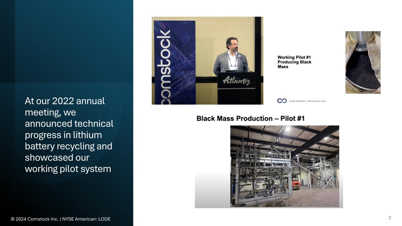 At our 2022 annual meeting, we announced technical progress in lithium battery recycling and showcased our working pilot system © 2024 Comstock Inc. | NYSE American: LODE 2
