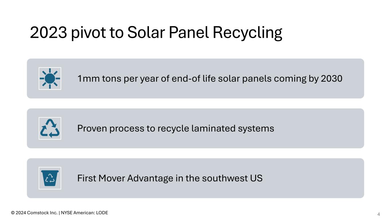 2023 pivot to Solar Panel Recycling 1mm tons per year of end-of life solar panels coming by 2030 Proven process to recycle laminated systems First Mover Advantage in the southwest US © 2024 Comstock Inc. | NYSE American: LODE 4